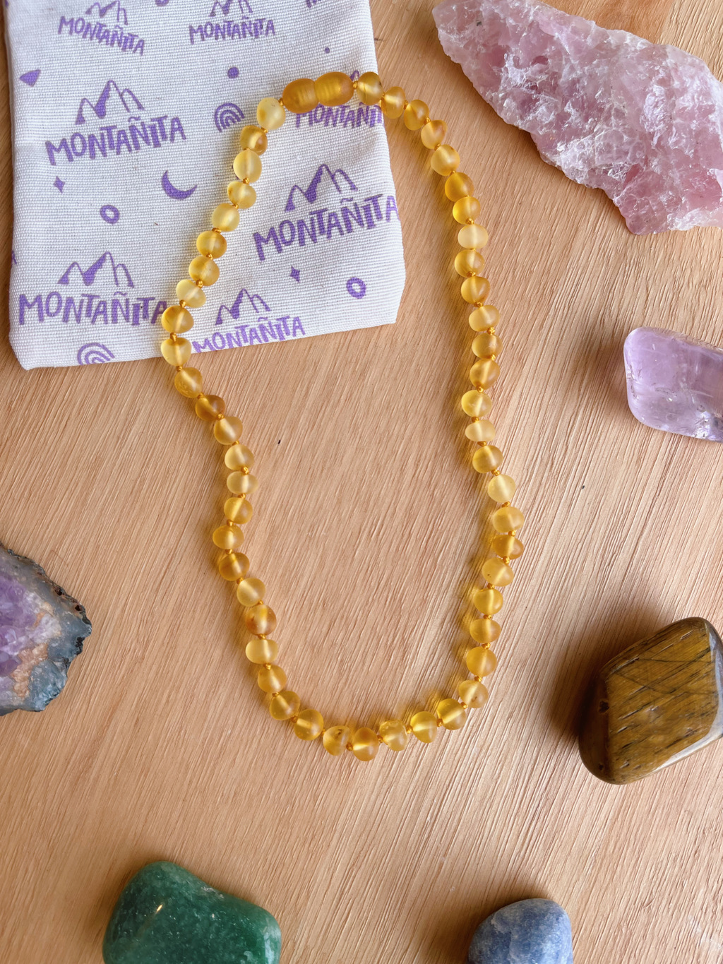 El ámbar contiene acido succínico, en contacto con el cuerpo es despedido y absorbido por nuestro torrente sanguíneo, actuando como analgésico y antiinflamatorio natural; alivia dolores cervicales, articulares, de artritis, calma alergias e infecciones, regula glandula tiroides y tambien estabiliza el sistema inmunológico general.