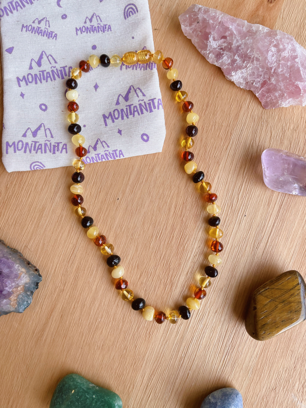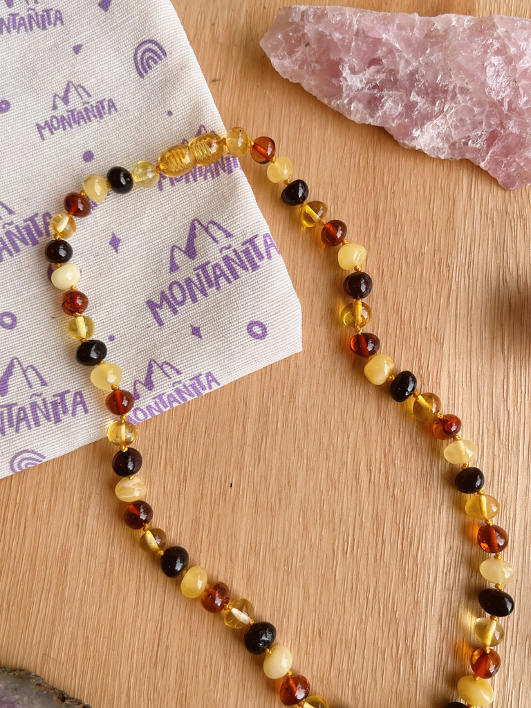 El ámbar contiene acido succinico, en contacto con el cuerpo es despedido y absorbido por nuestro torrente sanguineo, actuando como analgesico y antiinflamatorio natural; alivia dolores cervicales, articulares, de artritis, calma alergias e infecciones, regula glandula tiroides y tambien estabiliza el sistema inmunologico general.