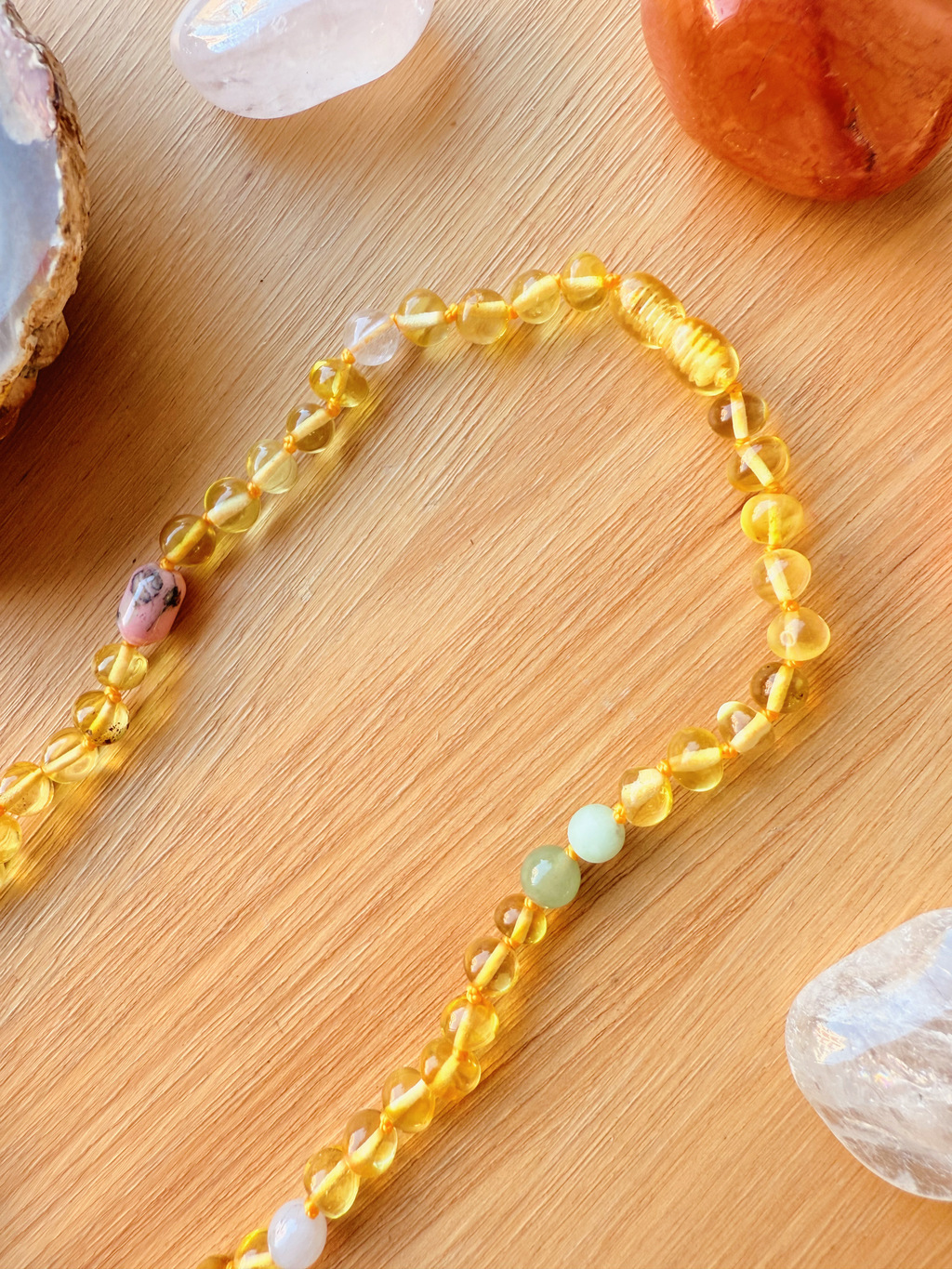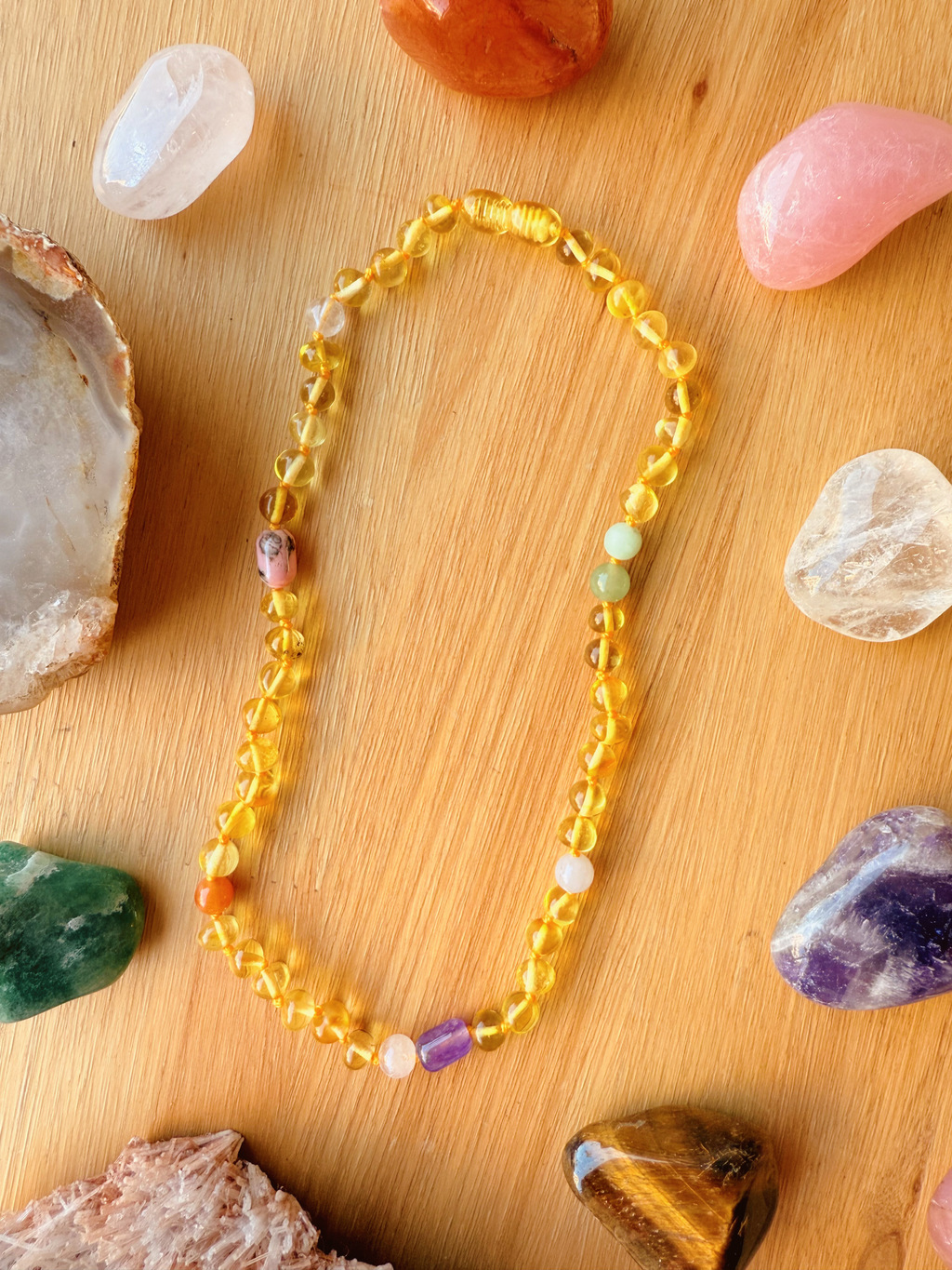 Es la unión de Ambar Miel con piedras naturales Cuarzo Verde, Jade Myanmar, Cuarzo Azul, Amatista, Cuarzo Rosa, Cornalina, Calfita y Citrino. CONSULTAR POR ESTE MODELO, PODEMOS ARMARLO! ❤️