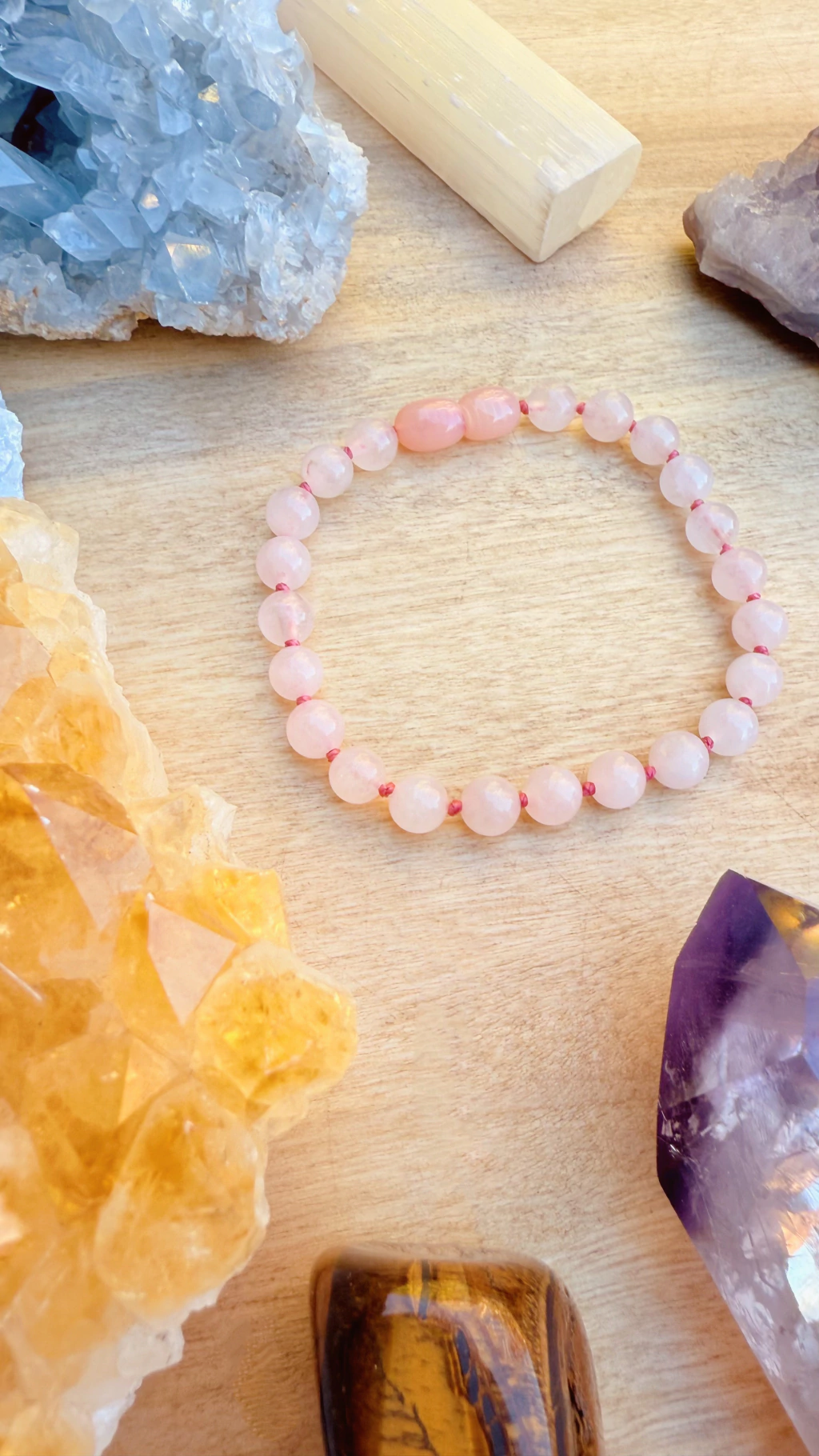 El Cuarzo Rosa es una piedra de amor incondicional y paz infinita. La más importante para el corazón, lo purifica y abre a todos los niveles. Calma, da seguridad y es excelente usarlo en casos de traumas o crisis. Facilita el perdón y la autoaceptacion, e invoca la autoestima y la confianza en uno mismo. Fortalece el corazón físico y el sistema circulatorio, libera impurezas de los fluidos corporales. Potencia la fertilidad. Ayuda en los casos de Alzheimer, enfermedad de párkinson y demencia senil. Esta armado con hilo extra resistente y anudado entre cuenta y cuenta para evitar problemas en caso de rotura, se cierra con tornillo plastico.