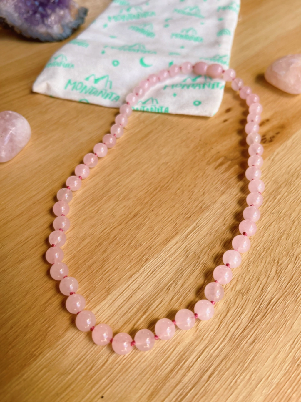 Este Collar Estrella Fugaz está compuesto por Cuarzo Rosa, una piedra de amor incondicional y paz infinita.