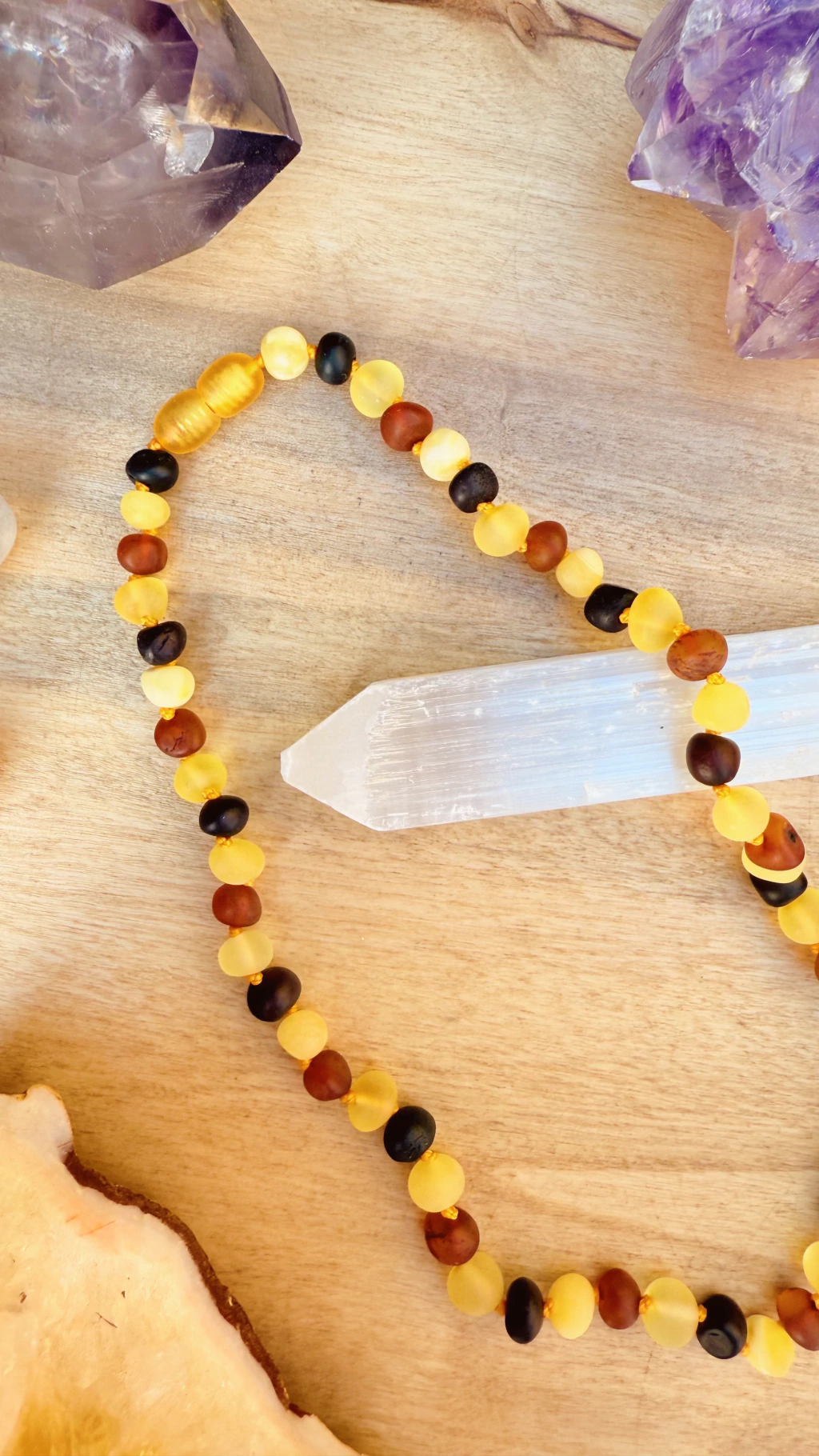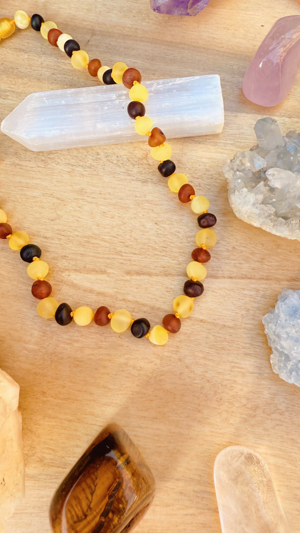 Este Collar Ámbar Multicolor SIN PULIR tiene todos los tonos de ámbar sin pulir: Cherry, Miel, Cognac y Manteca.