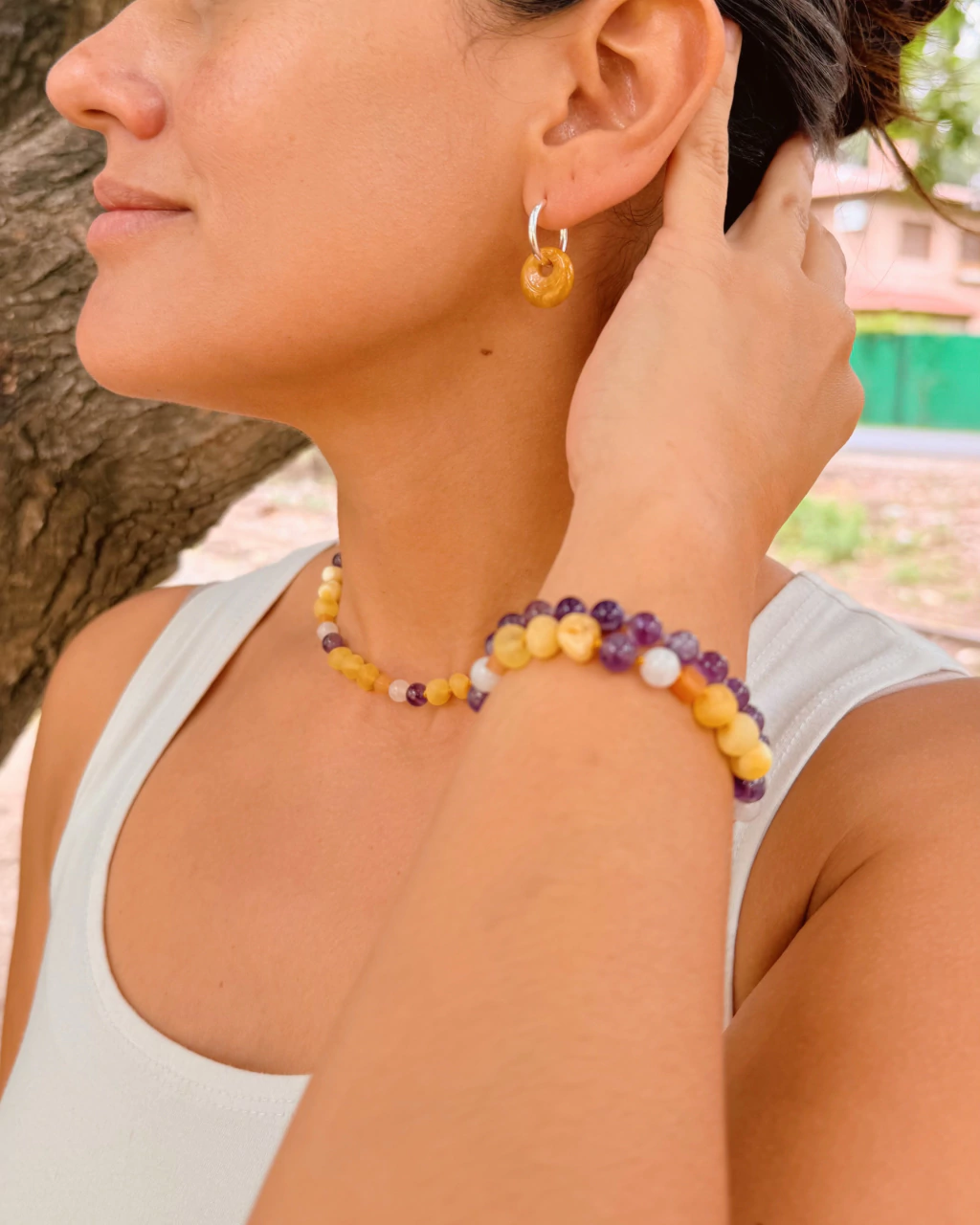 Piedras de la pulsera: Ámbar, Topacio, Piedra Luna y Amatista.