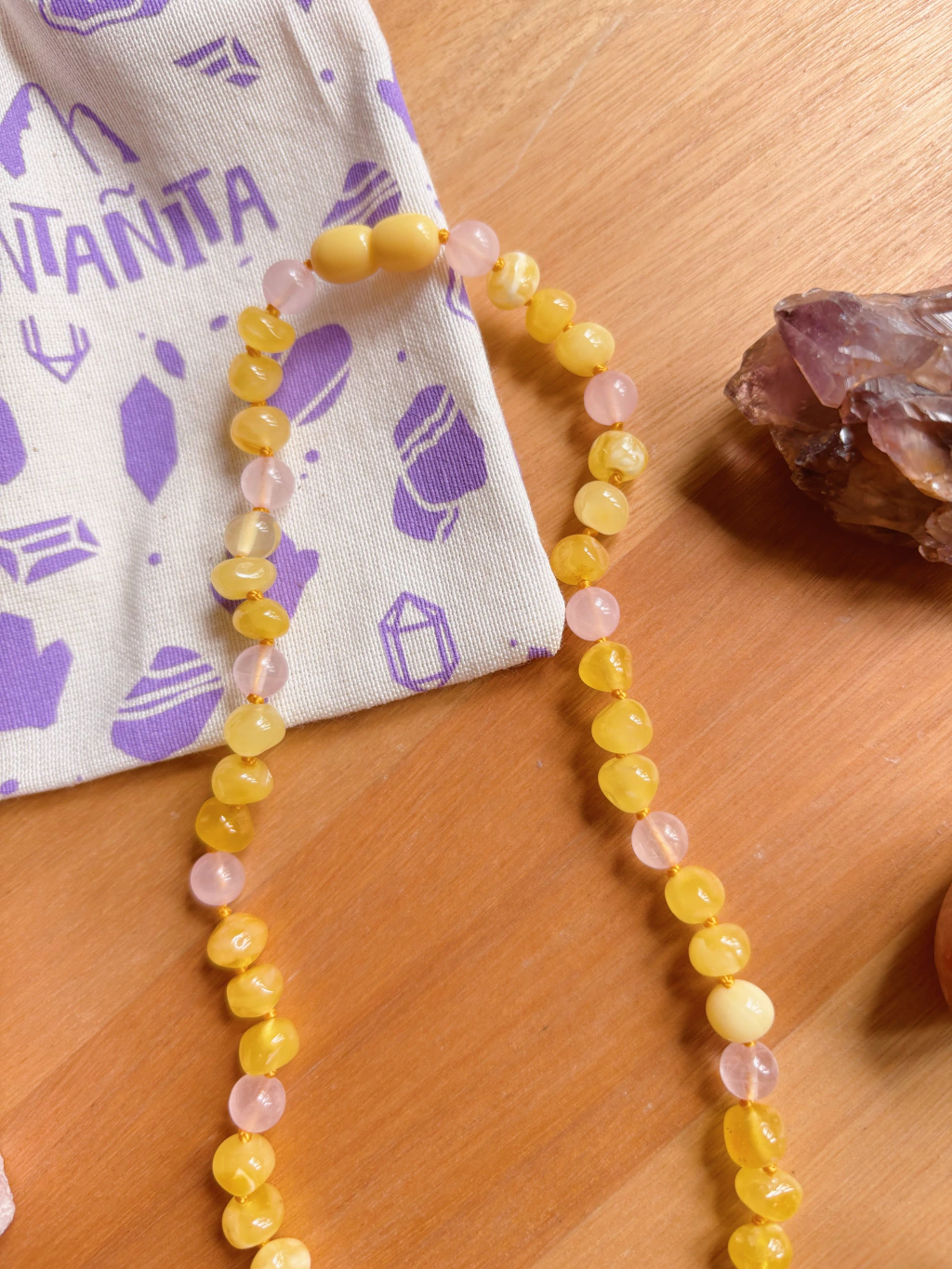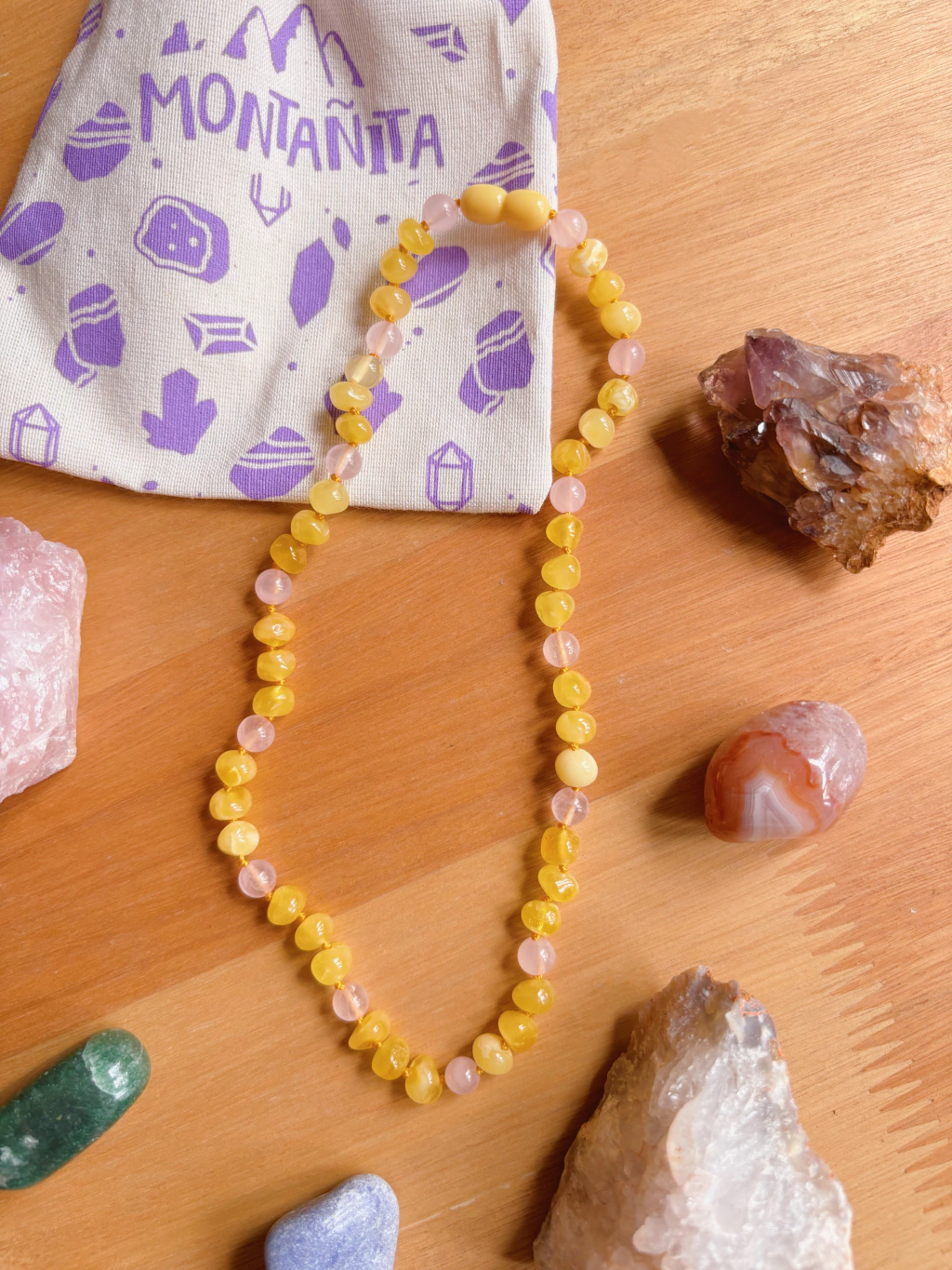 El Collar Brote es la unión de Ámbar Manteca combinado con Cuarzo Rosa, dos piedras naturales con poderosas propiedades curativas y energéticas. Ideal para quienes buscan protección, amor y bienestar emocional.