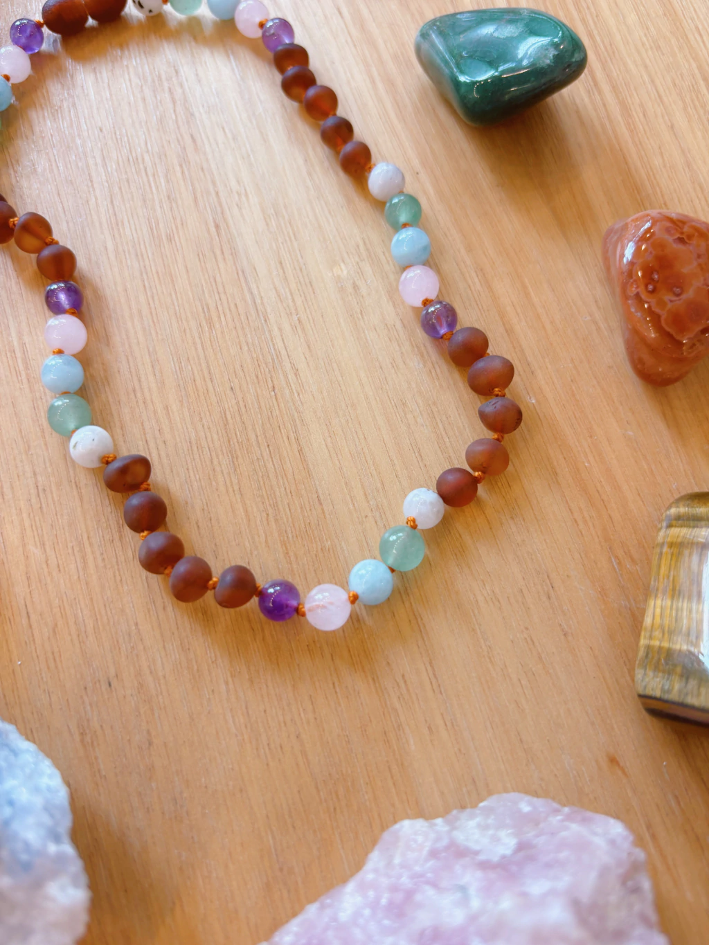 Este Collar Montañita une Ámbar Cognac Sin Pulir, Amatista, Cuarzo Rosa, Aguamarina, Cuarzo Verde y Piedra Luna.