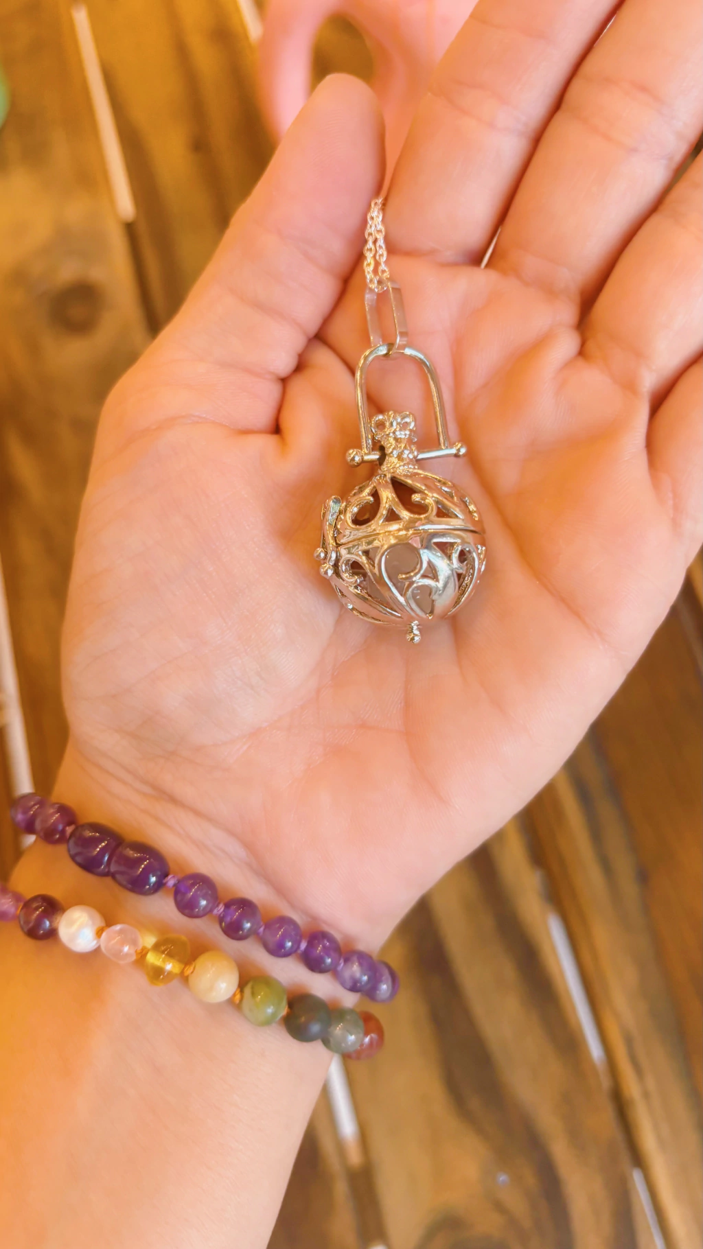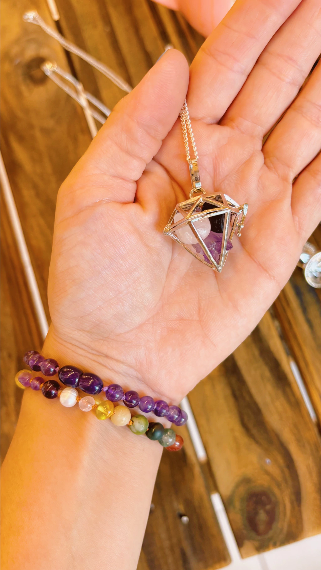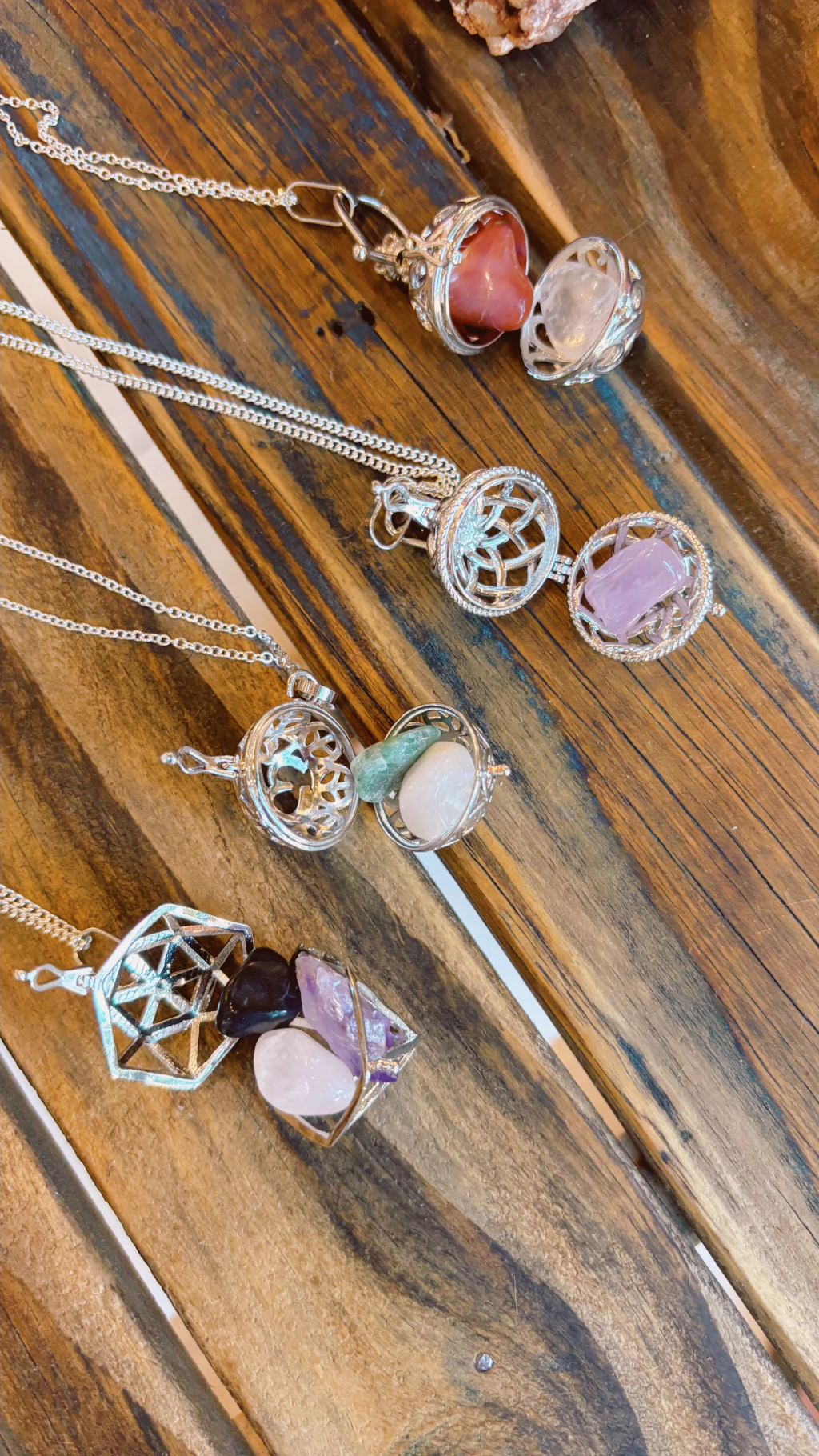 Este collar está compuesto por una cadena de acero quirúrgico de 45 cm con un porta piedras con baño de níquel. Dentro de este porta piedras se encuentran piedras aleatorias (entre 2 y 3) , cada una con propiedades únicas que aportan energía y bienestar.