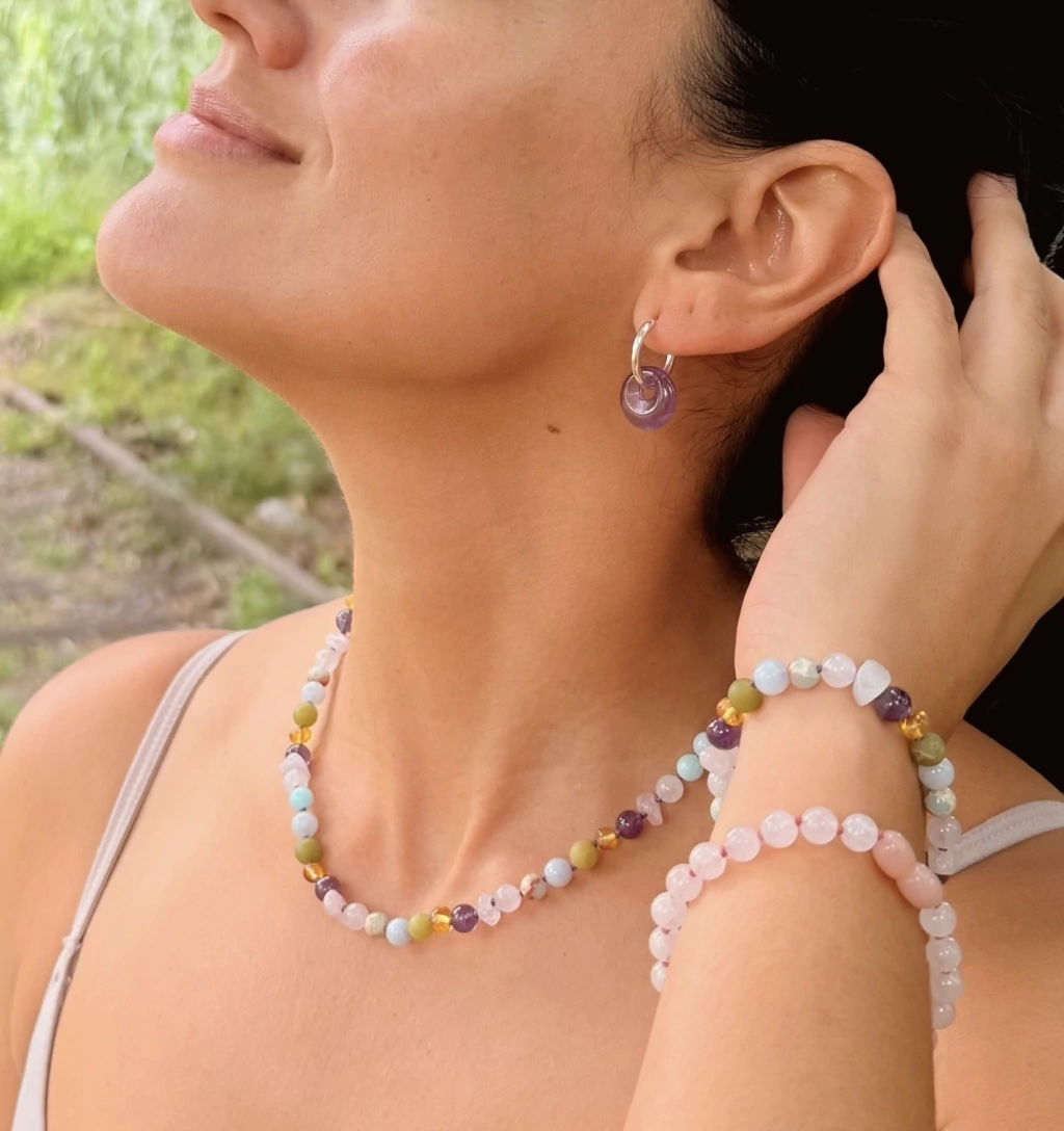 La Pulsera Inspiración es una pieza energética creada para elevar la creatividad, la calma y la conexión interior. Está unida por cuarzo rosa, amatista, larimar, ámbar, aguamarina y jade verde, formando un equilibrio perfecto entre suavidad, claridad y bienestar emocional.