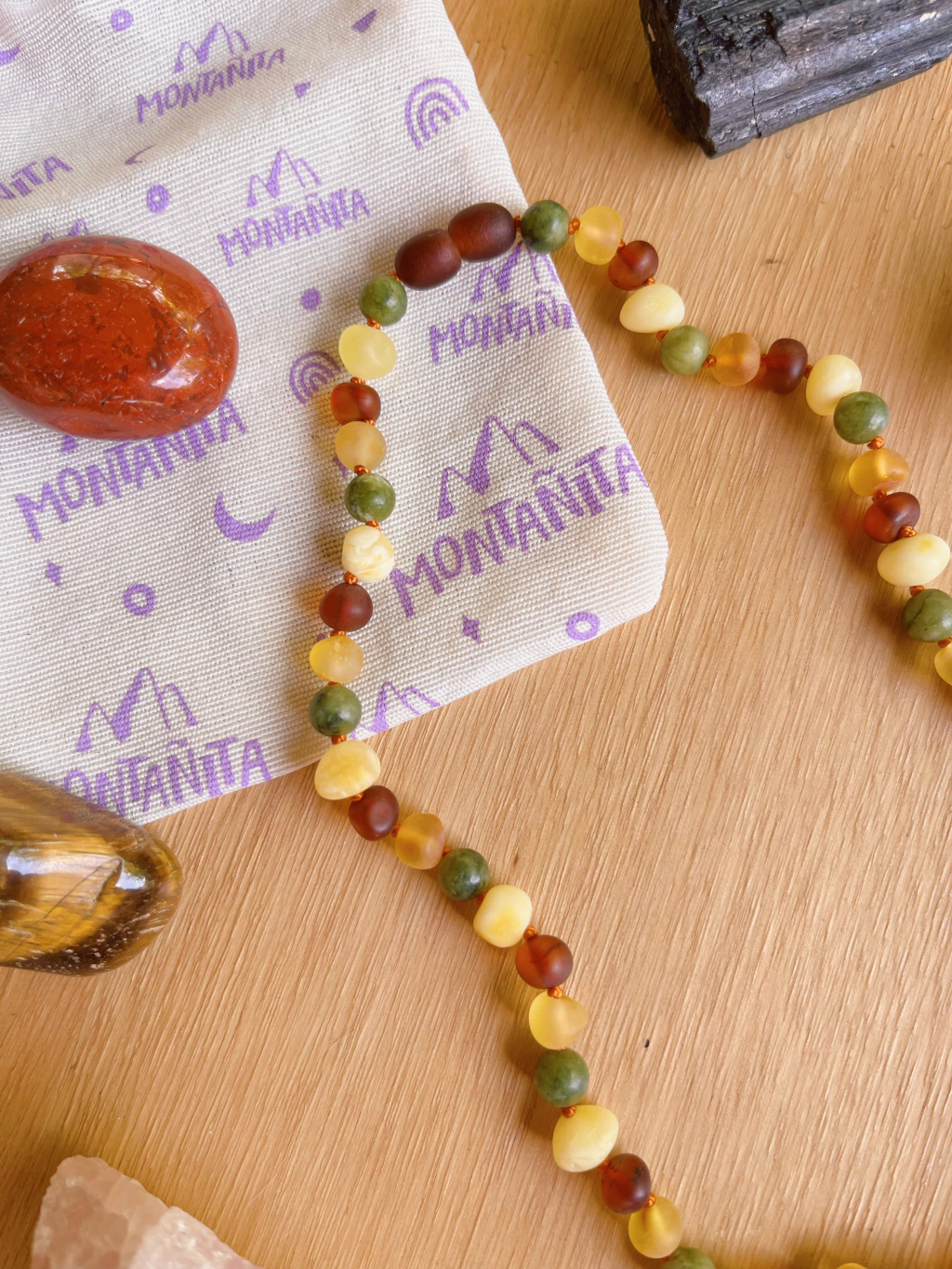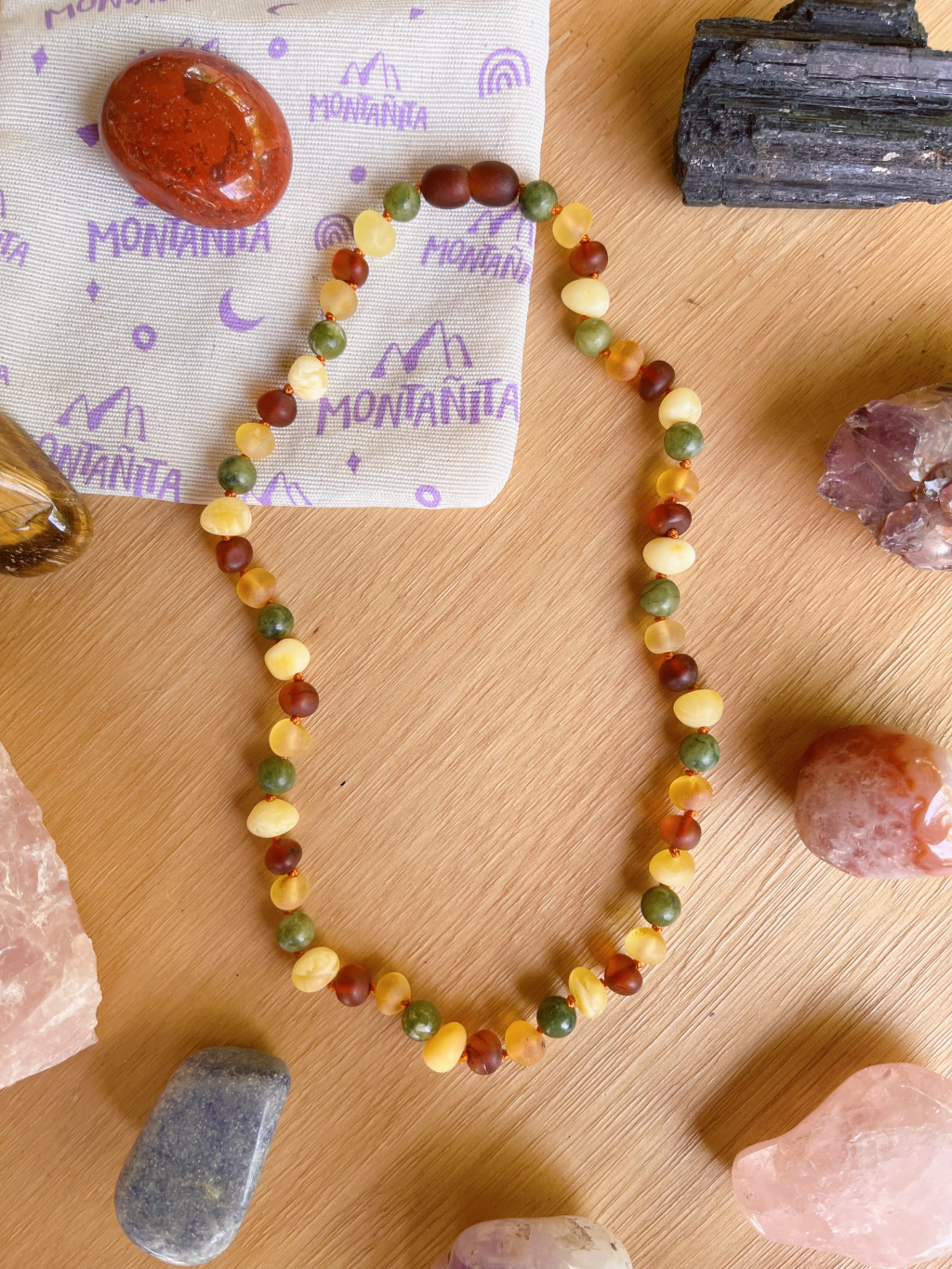El Collar Raíz está armado con ámbar Miel, Cognac, Manteca sin pulir y Jade Verde.