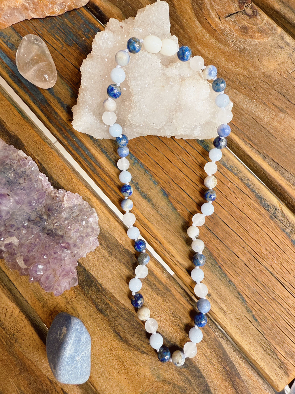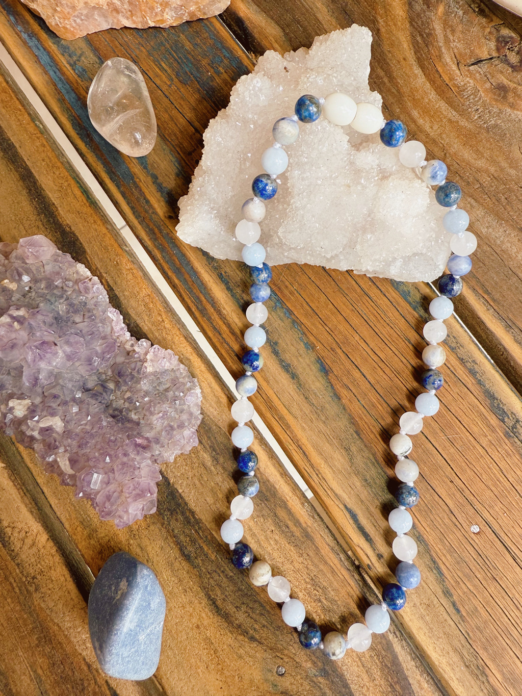 El Collar Agua es una pieza única que combina la elegancia de las Perlas de Agua Dulce con la energía sanadora de piedras como Sodalita, Aguamarina, Lapislázuli y Cuarzo Blanco. Ideal para quienes buscan claridad mental, equilibrio emocional y bienestar general, este collar te conecta con las energías más puras y tranquilizadoras de la naturaleza.