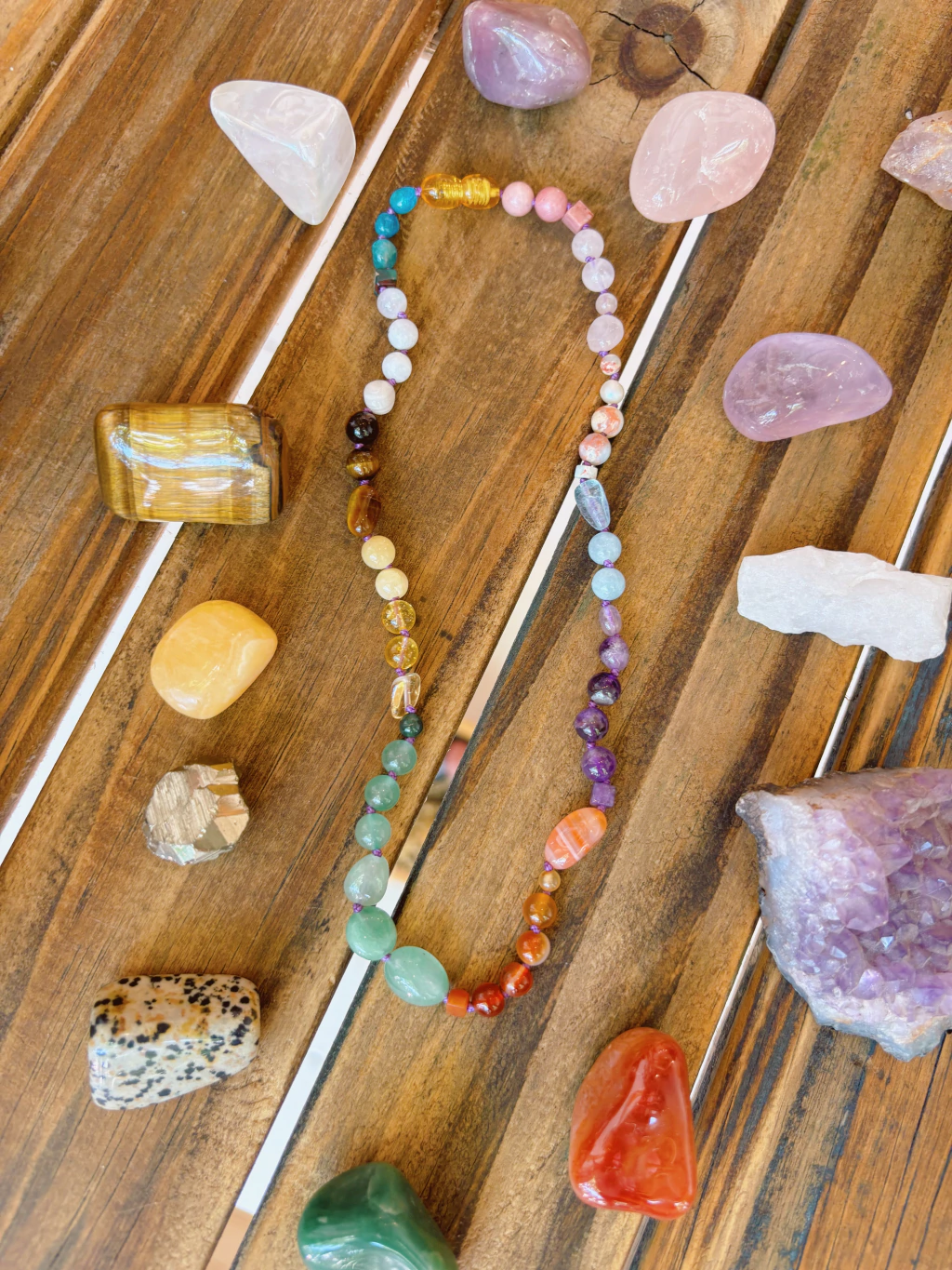 Las piedras de este collar están seleccionadas por sus propiedades energéticas. Se dice que ayudan a equilibrar las emociones, promoviendo la calma y la armonía en tu día a día. Cada color del arco iris representa diferentes energías que pueden influir positivamente en tu estado emocional.