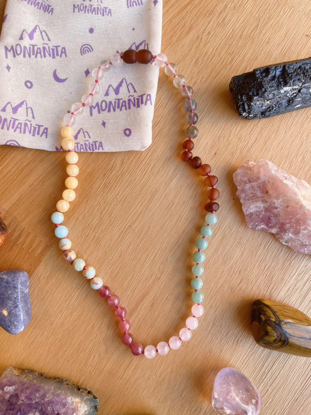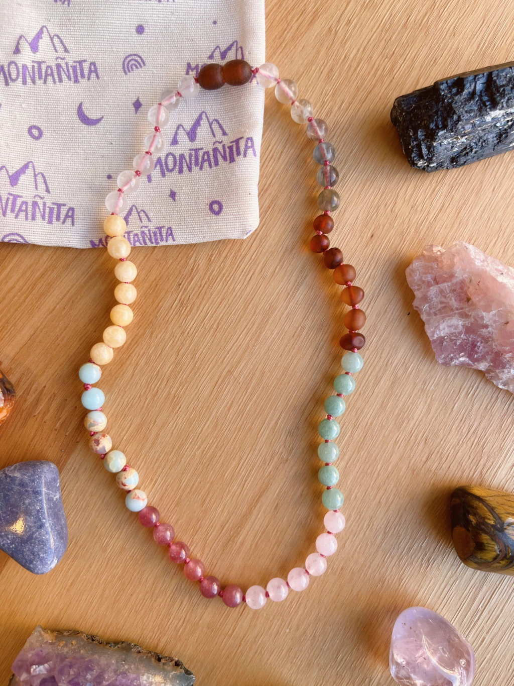 El Collar Astros es una pieza artesanal única que une Fluorita, Ámbar, Jade Myanmar, Cuarzo Rosa, Cuarzo Fresa, Larimar, Calcita y Cuarzo Cristal, pensado para aportar equilibrio, claridad y bienestar integral.