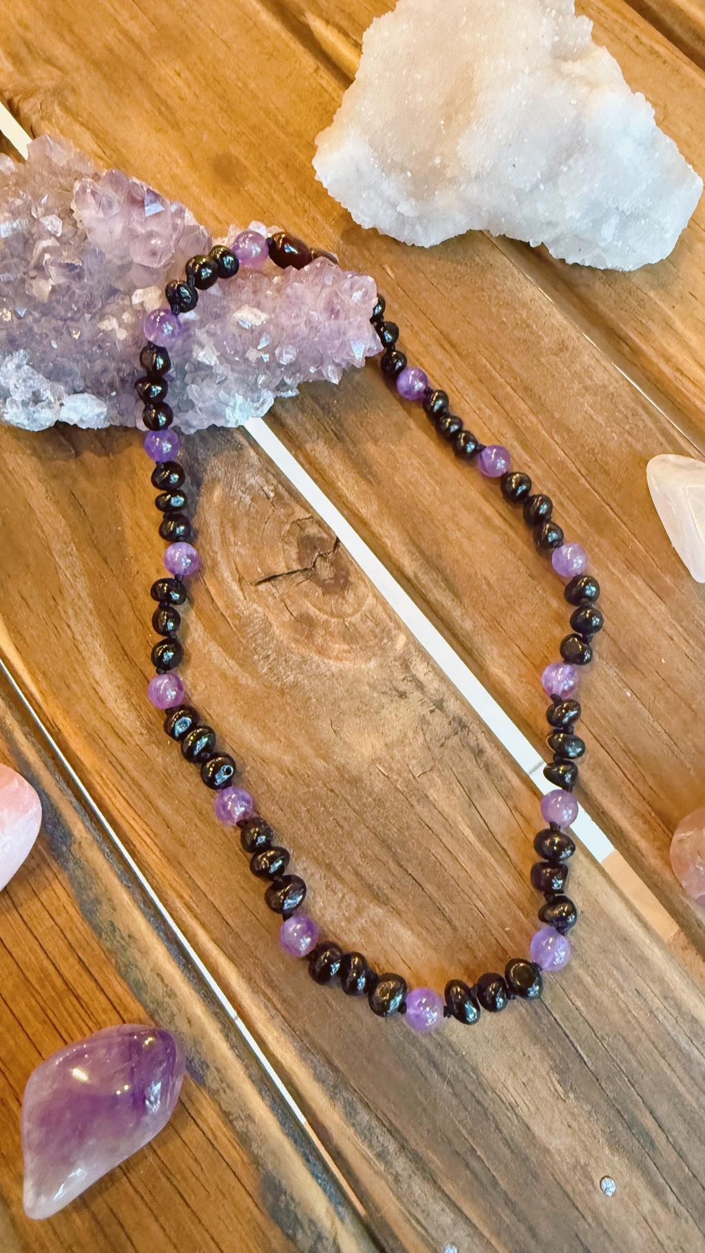 El Collar Brote es una pieza artesanal que une la calidez del Ámbar Cherry con la energía protectora de la Amatista. Ideal para quienes buscan armonía, alivio físico y equilibrio emocional en su día a día.