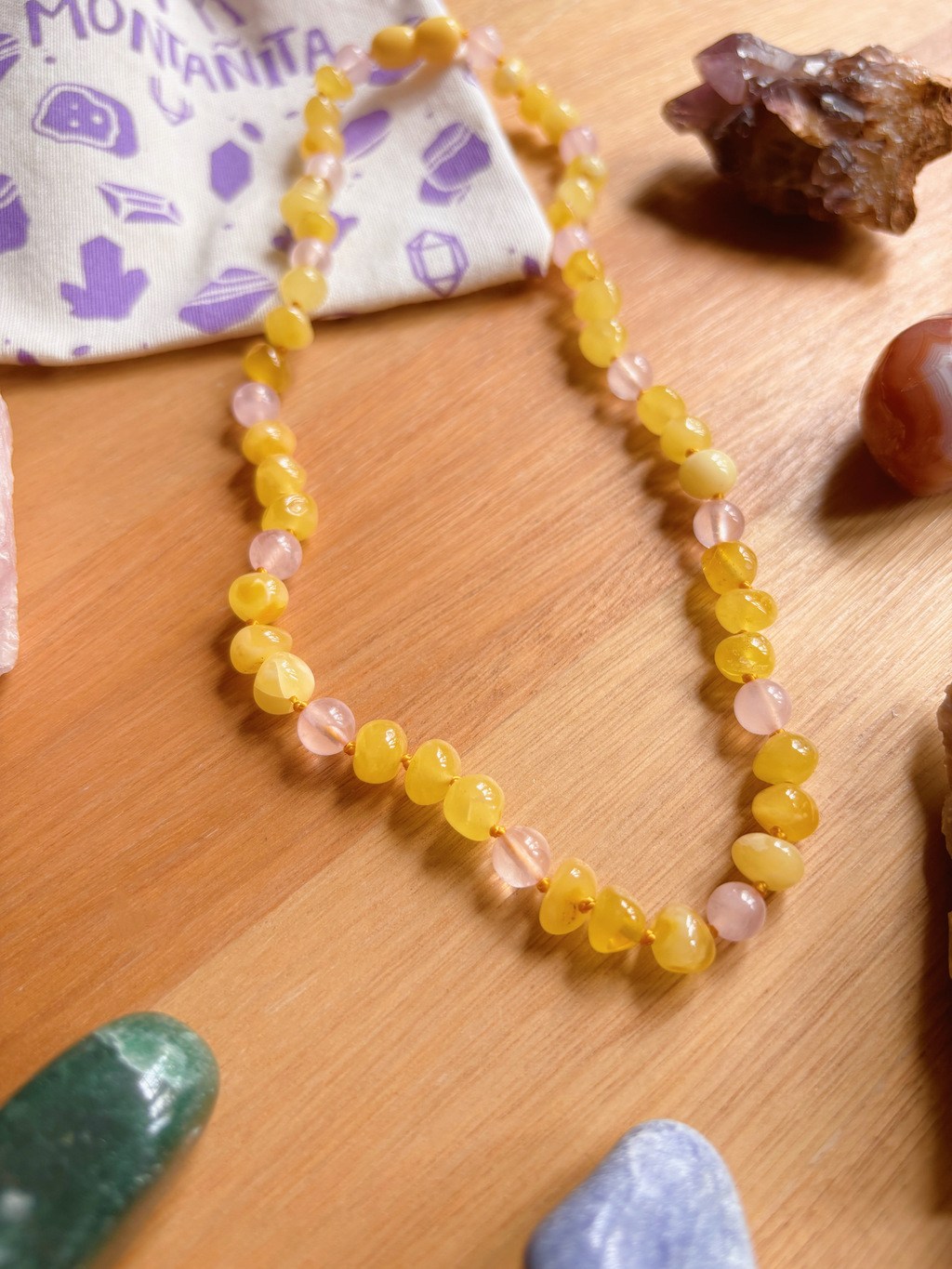 El Collar Brote es la unión de Ámbar Manteca combinado con Cuarzo Rosa, dos piedras naturales con poderosas propiedades curativas y energéticas. Ideal para quienes buscan protección, amor y bienestar emocional.