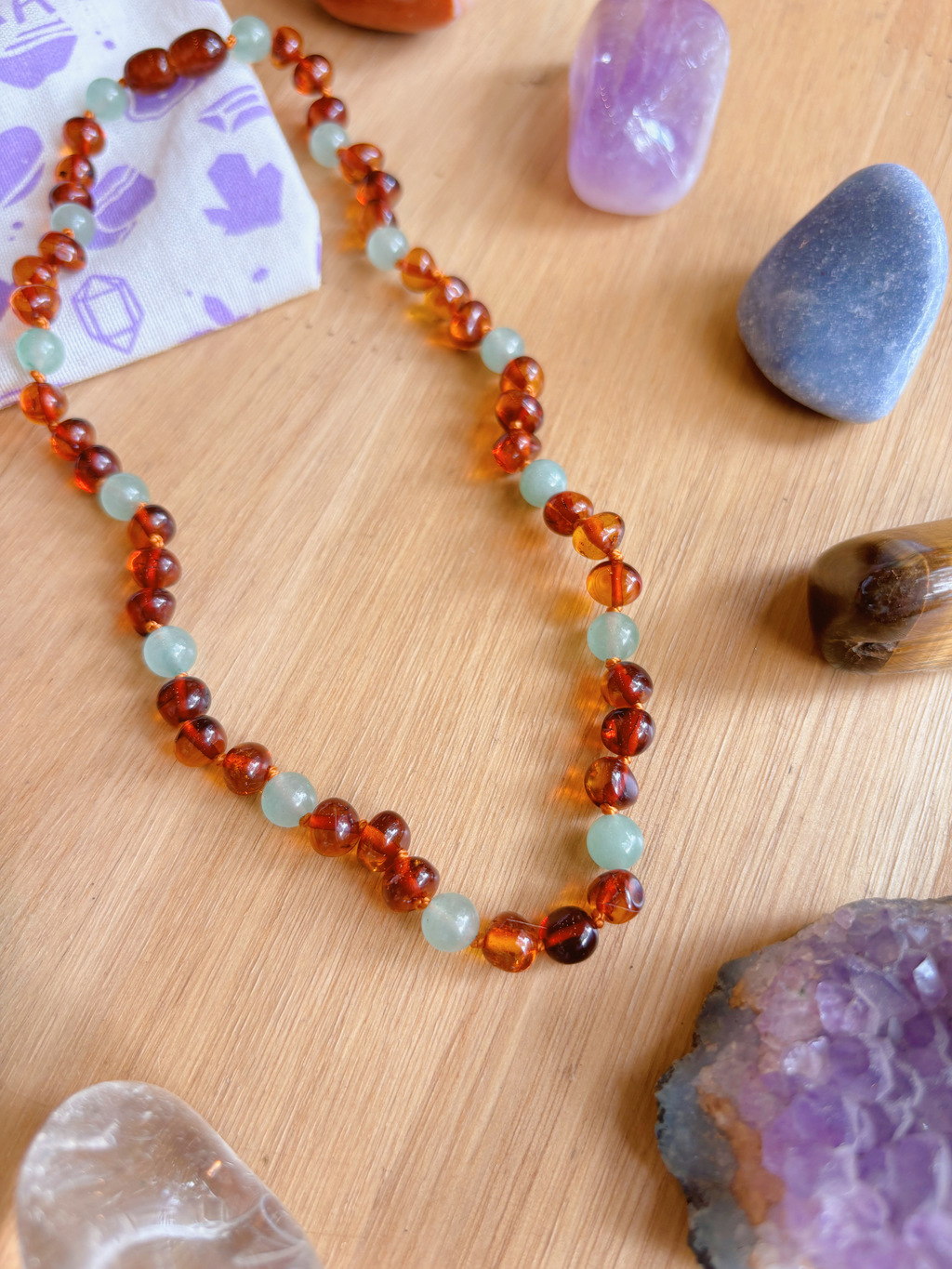 El Collar Brote es la unión de Ámbar Cognac con Cuarzo Verde, una combinación perfecta de propiedades curativas y energéticas que brindan bienestar físico y emocional.