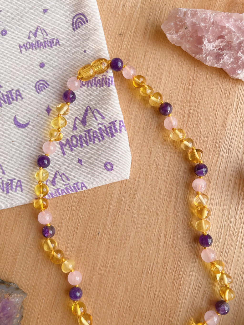 Este collar es una hermosa combinación de Ámbar Miel con Amatista y Cuarzo Rosa, brindando una conexión profunda con la energía sanadora de la naturaleza. Ideal para quienes buscan armonía, alivio físico y equilibrio emocional en su día a día.