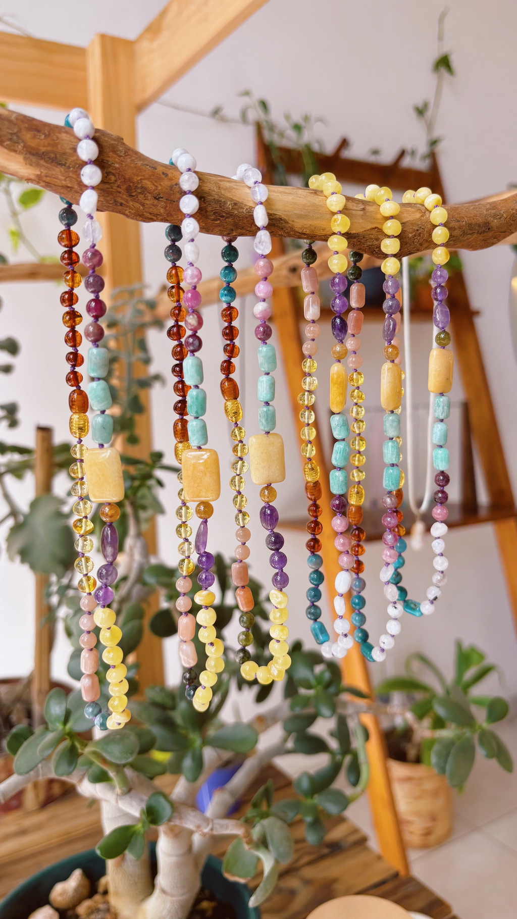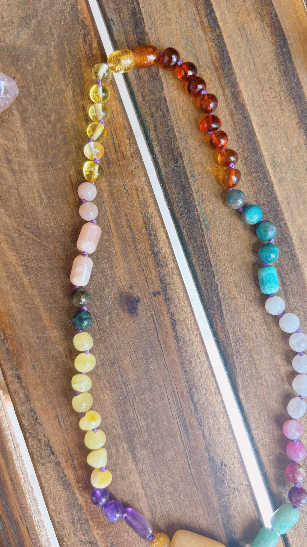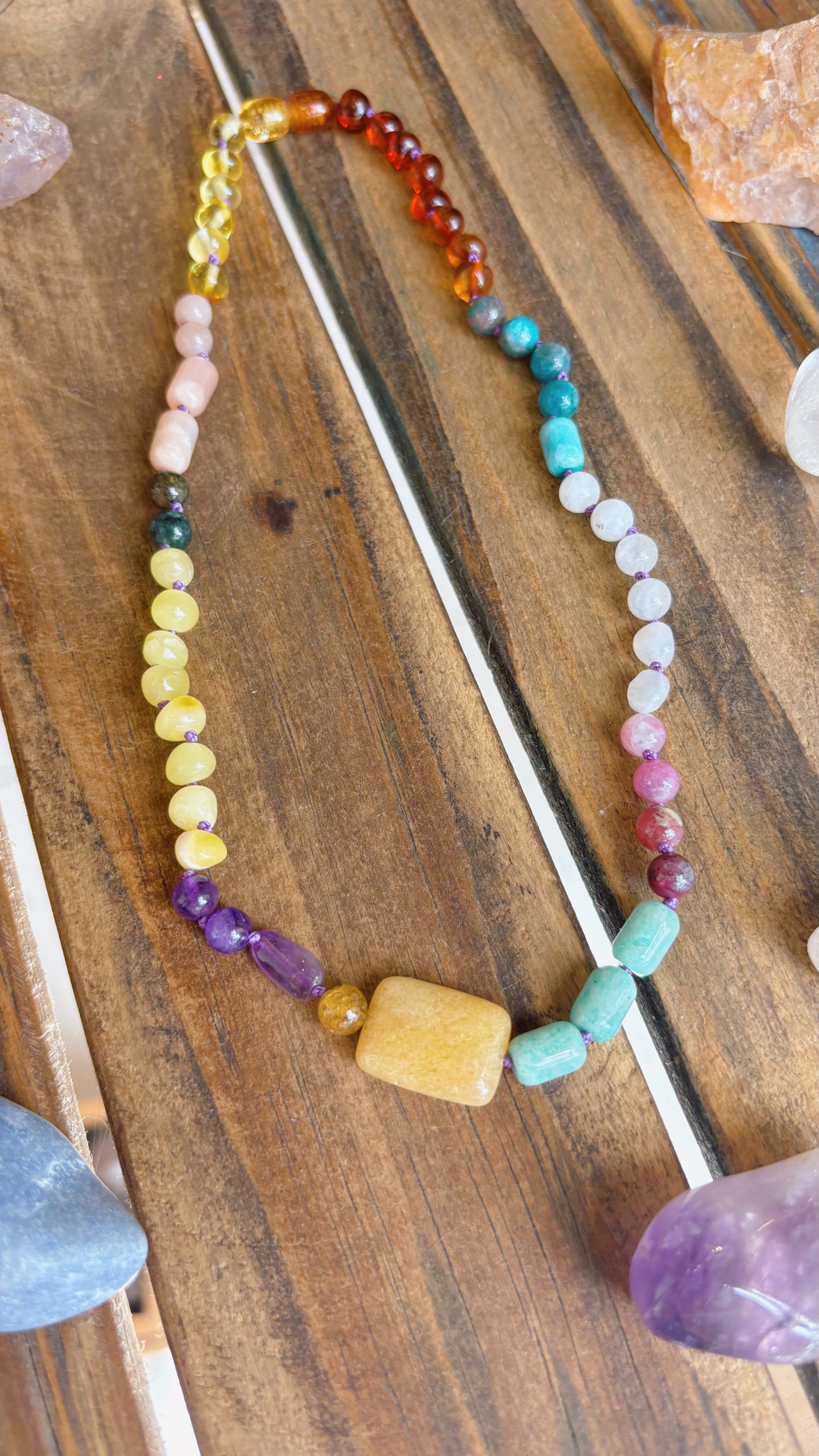 Descubre la belleza y las propiedades únicas del Collar Disfrute, que combina ámbar en tonos miel, cognac y manteca, junto a una variedad de piedras naturales de distintos tamaños. Este collar es una celebración de la naturaleza, diseñado para brindarte no solo estilo, sino también bienestar.