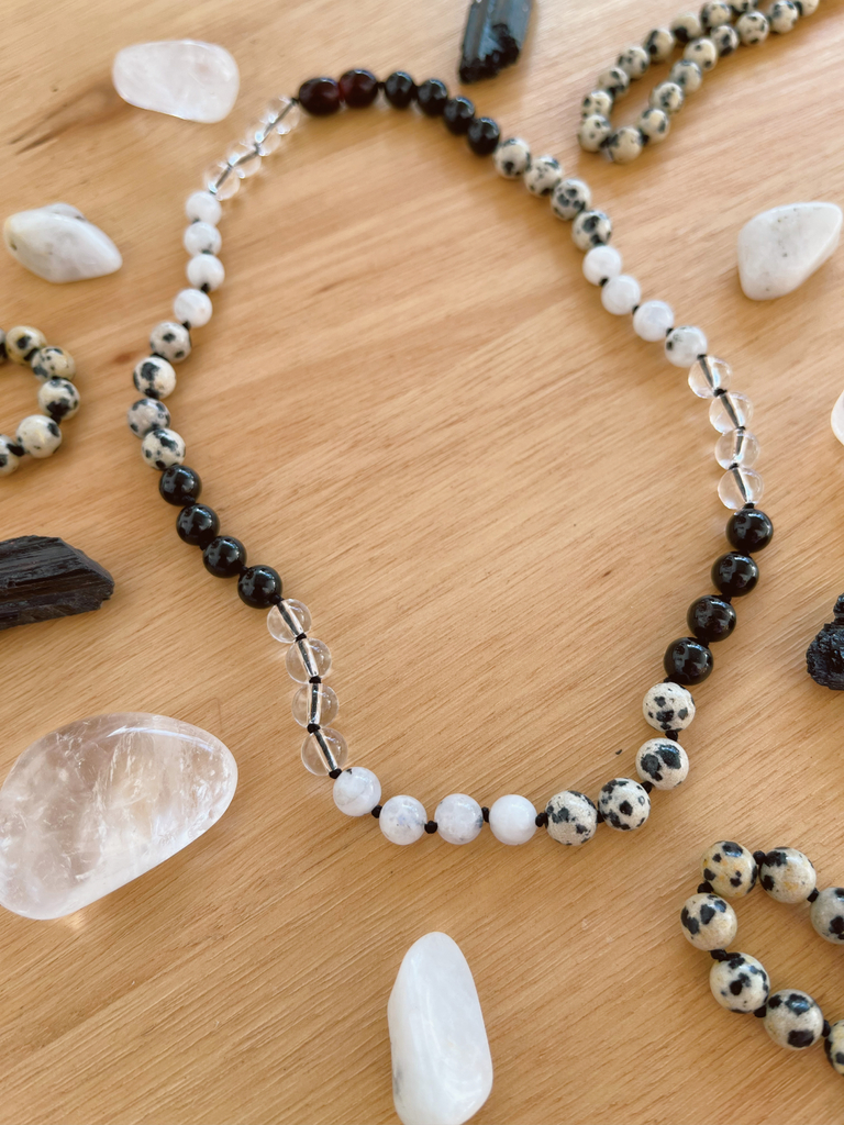 El Collar Invierno es una combinación perfecta de Turmalina, Cuarzo Cristal, Jaspe Dálmata y Piedra Luna. Un accesorio que te conecta con las energías de transformación, protección y equilibrio. Ideal para quienes buscan serenidad, bienestar emocional y claridad en su vida.