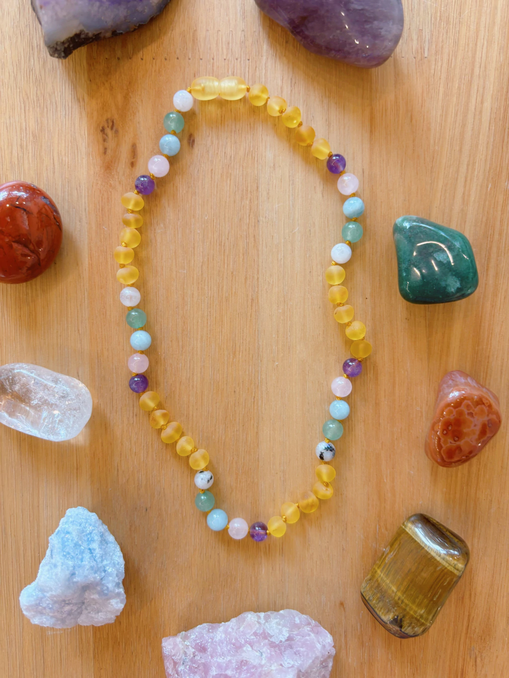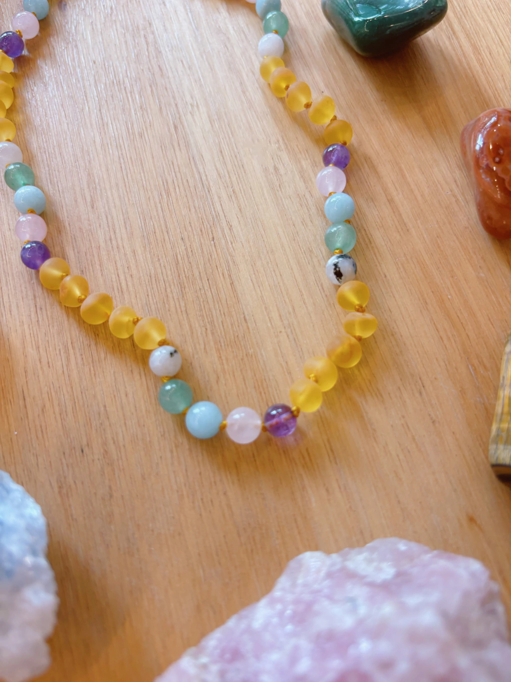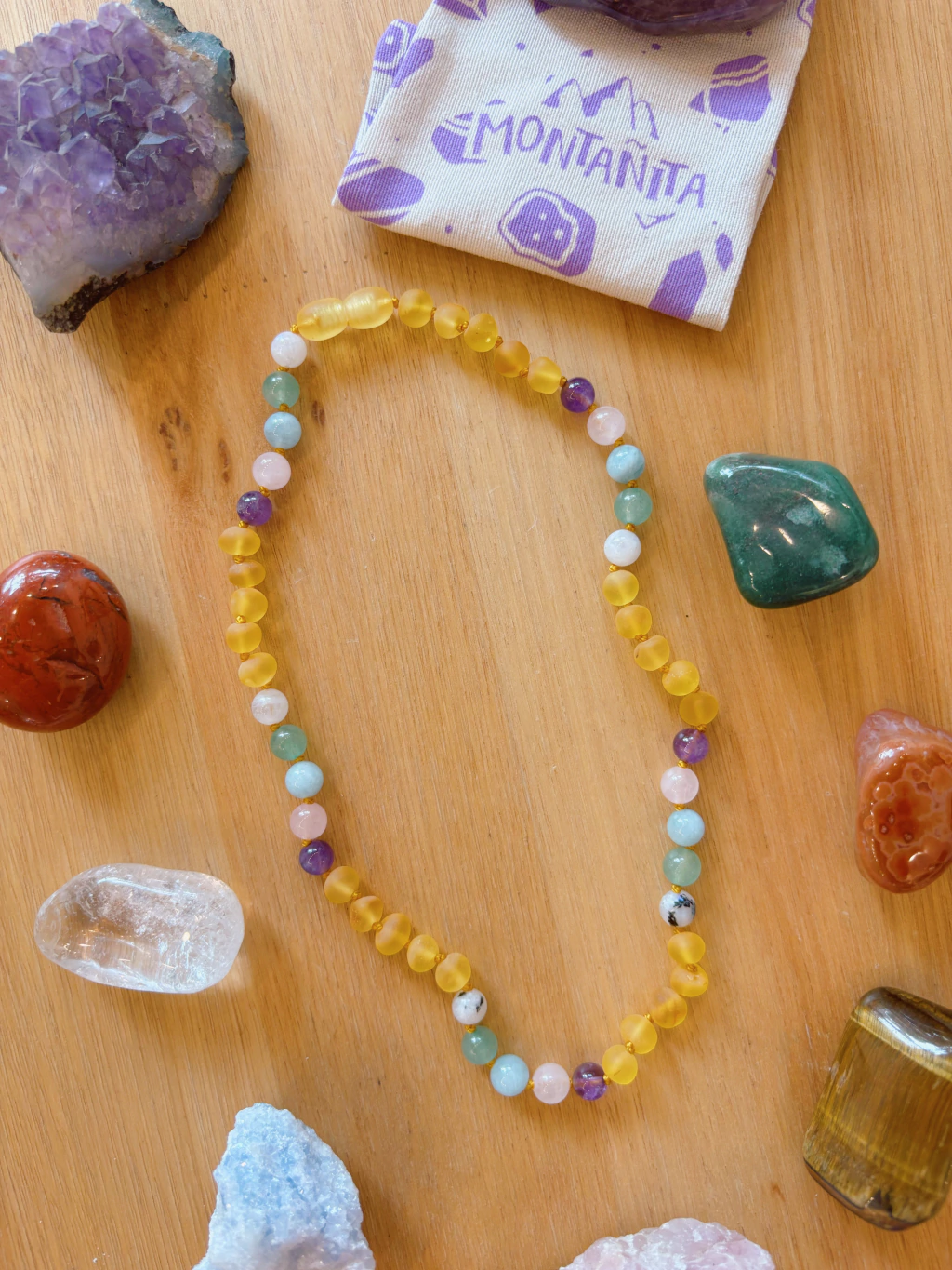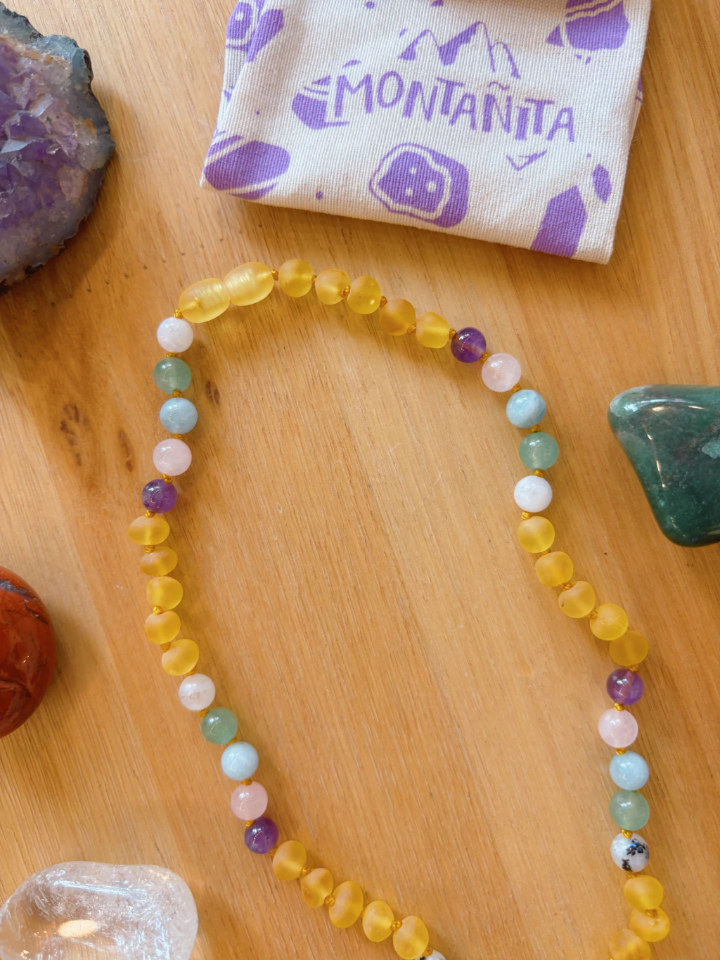 Este Collar Montañita une Ámbar Miel Sin Pulir, Amatista, Cuarzo Rosa, Aguamarina, Cuarzo Verde y Piedra Luna.