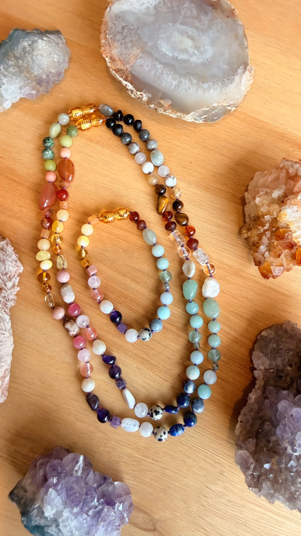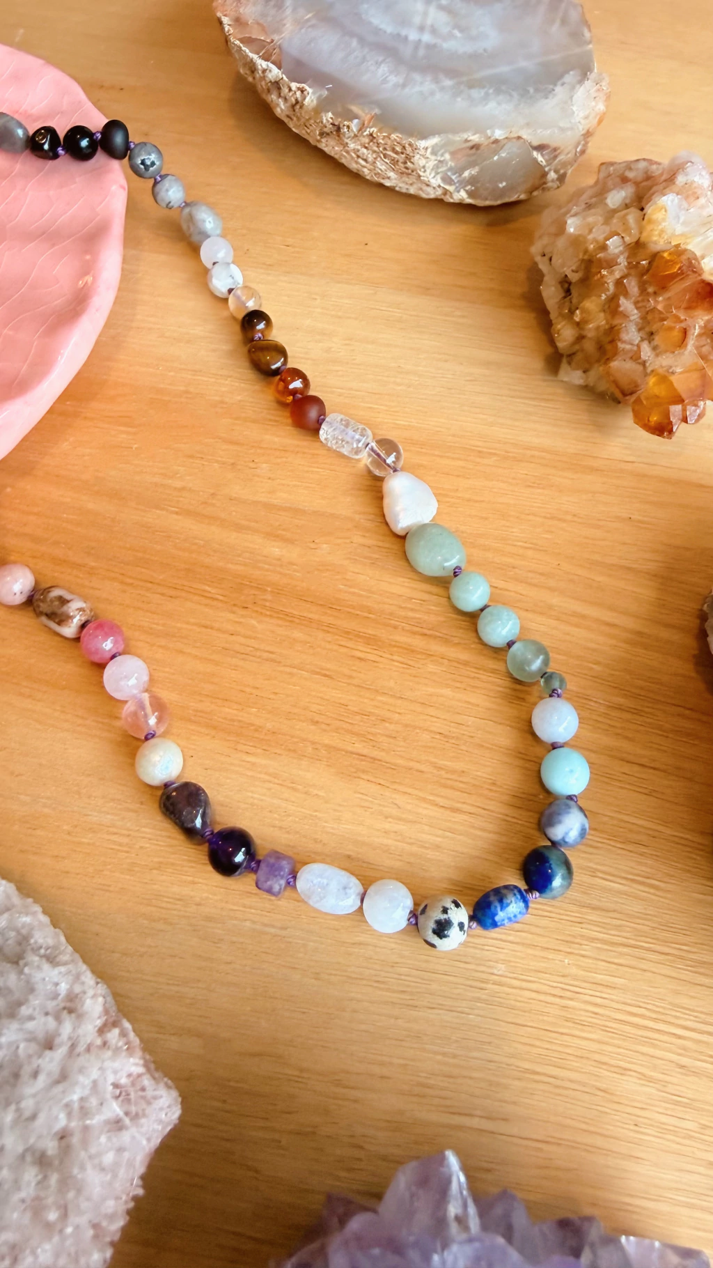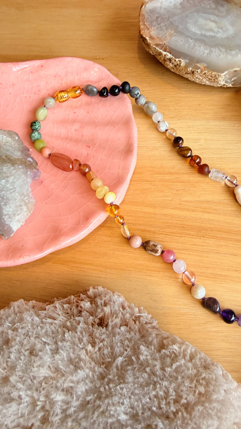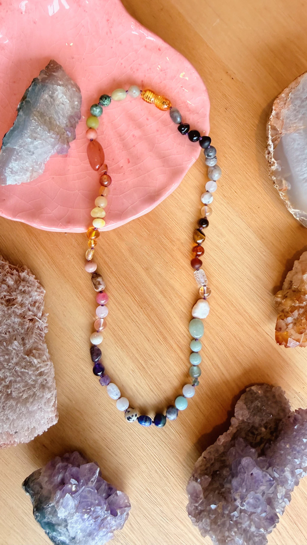 Este collar es la unión de una variedad de piedras cuidadosamente seleccionadas para aportar equilibrio, protección y energía positiva. Cada piedra tiene propiedades únicas que se complementan entre sí para acompañarte en tu día a día.