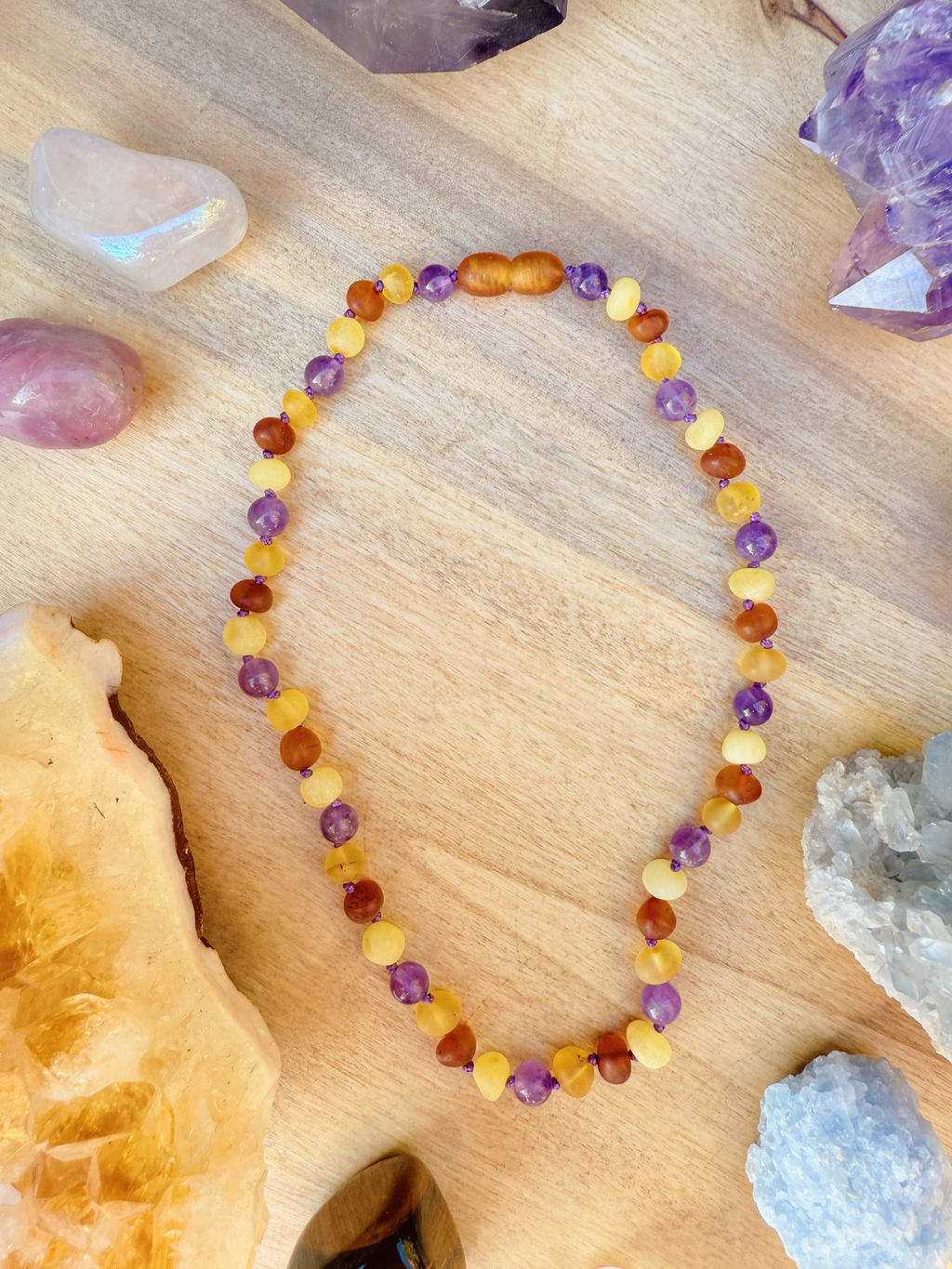 El Collar Raíz es una pieza única que fusiona Ámbar Miel, Cognac, Manteca y Amatista, ofreciendo tanto protección como equilibrio a quienes lo llevan. Cada piedra ha sido seleccionada por sus propiedades curativas y energéticas, ideal para quienes buscan bienestar y estabilidad emocional.