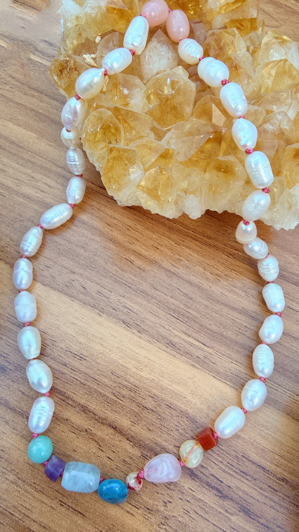 El Collar Vida es una pieza artesanal única que combina la delicadeza de las Perlas de Río con la energía vibrante de piedras naturales como Amazonita, Amatista, Aguamarina, Apatito, Larimar, Cuarzo Rosa, Citrino y Topacio.