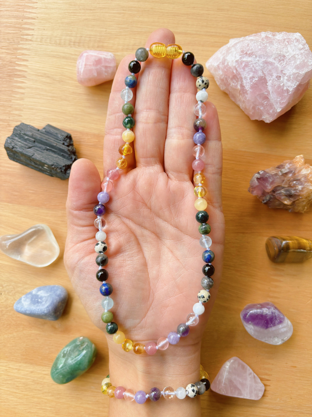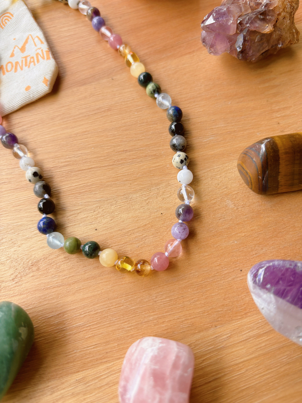 El collar Intención está compuesto por una variedad de piedras naturales cuidadosamente seleccionadas, cada una con su energía única. La combinación de Cuarzo Cristal, Piedra Luna, Jaspe Dálmata, Labradorita, Turmalina, Lapislázuli, Aguamarina, Jade Verde, Ágata Musgo, Calcita, Ámbar, Citrino, Cuarzo Fresa, Rodolita y Amatista hace de este collar una joya energética poderosa que te acompañará para promover el equilibrio, la serenidad, el amor y la protección.