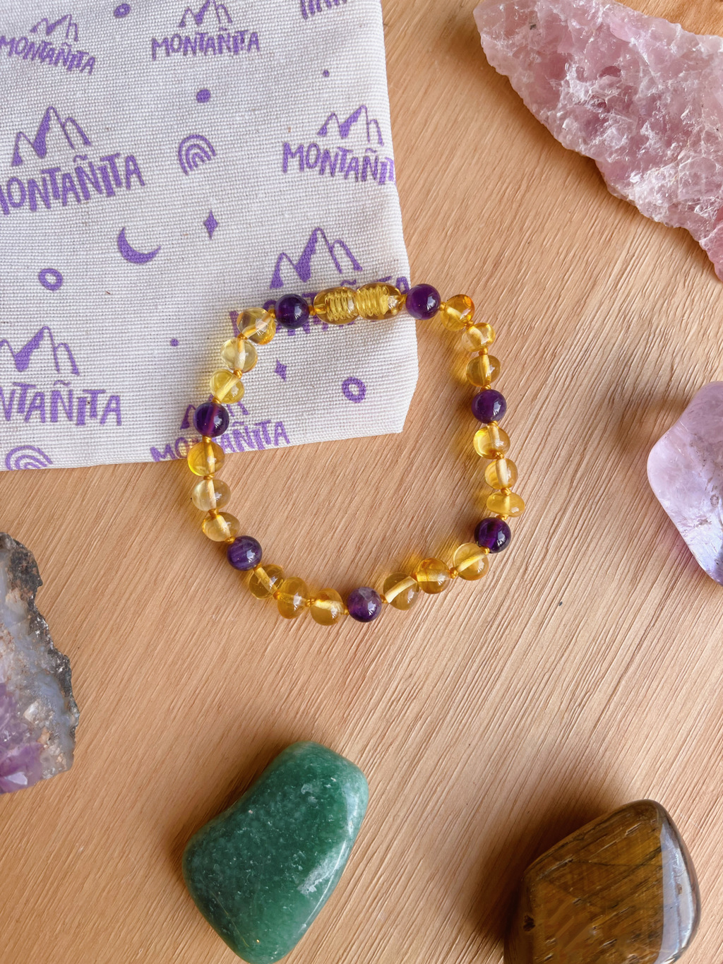Pulsera Brote es la unión de Ámbar Miel combinado con Amatista.