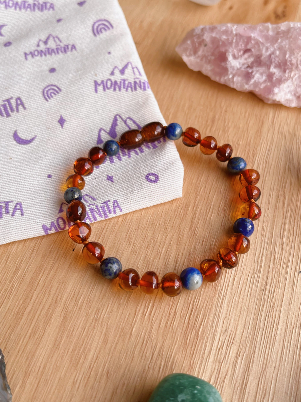 El ámbar contiene ácido succínico, que al entrar en contacto con el cuerpo es absorbido por el torrente sanguíneo, actuando como analgésico y antiinflamatorio natural.