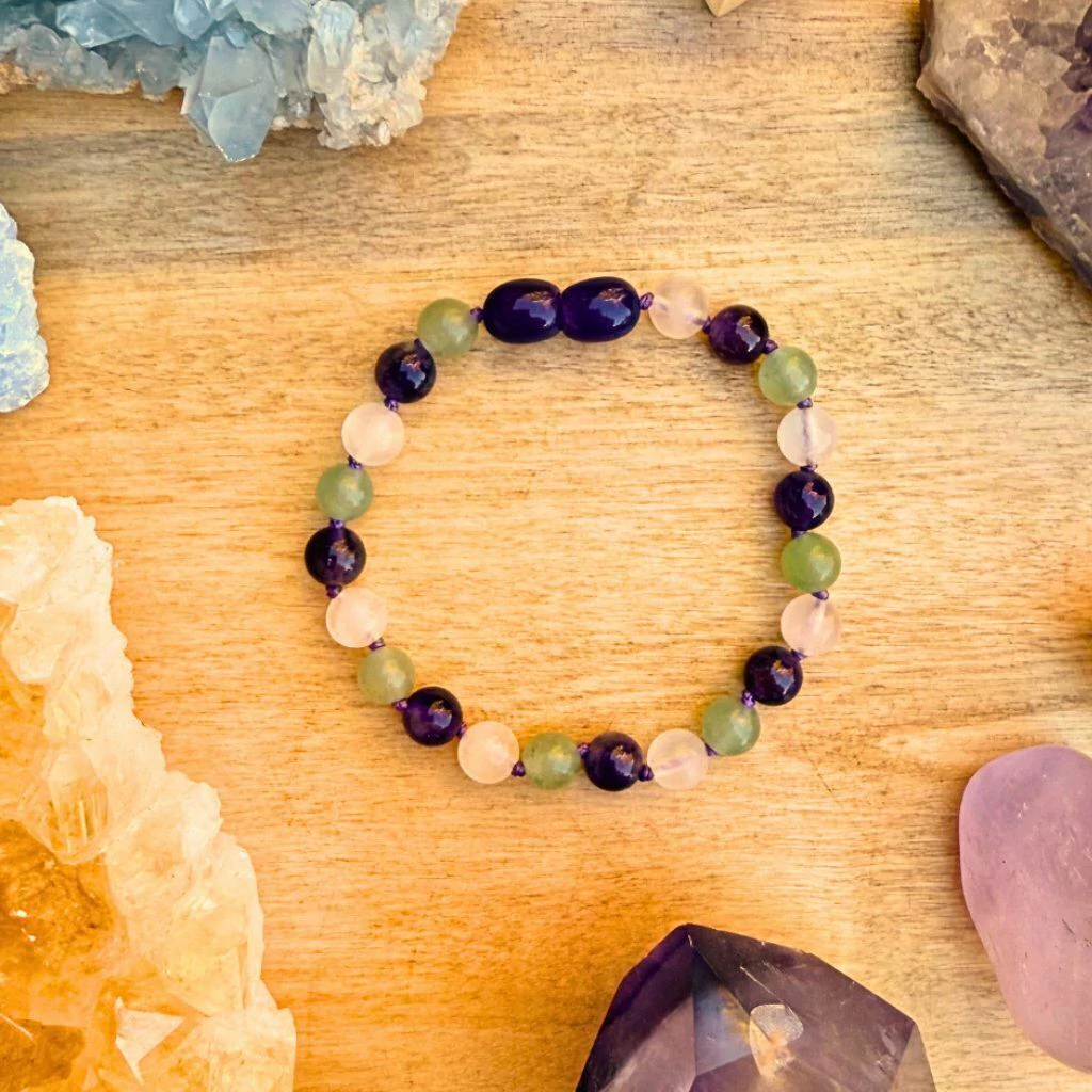 La pulsera Fortaleza es la unión de Amatista, Cuarzo Rosa y Cuarzo Verde.