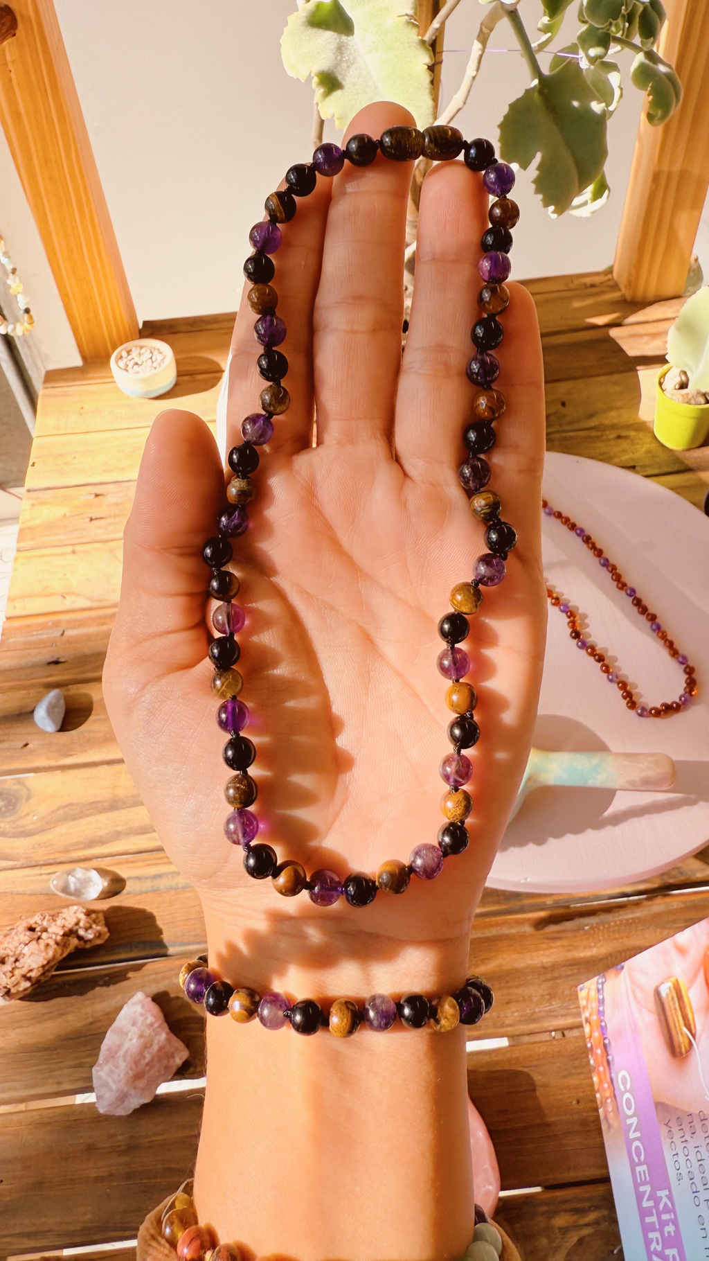 La Pulsera Protección está diseñada para brindarte bienestar, equilibrio y protección. Unido por Amatista, Turmalina y Ojo de Tigre, cada piedra ha sido seleccionada cuidadosamente por sus poderosas propiedades energéticas.