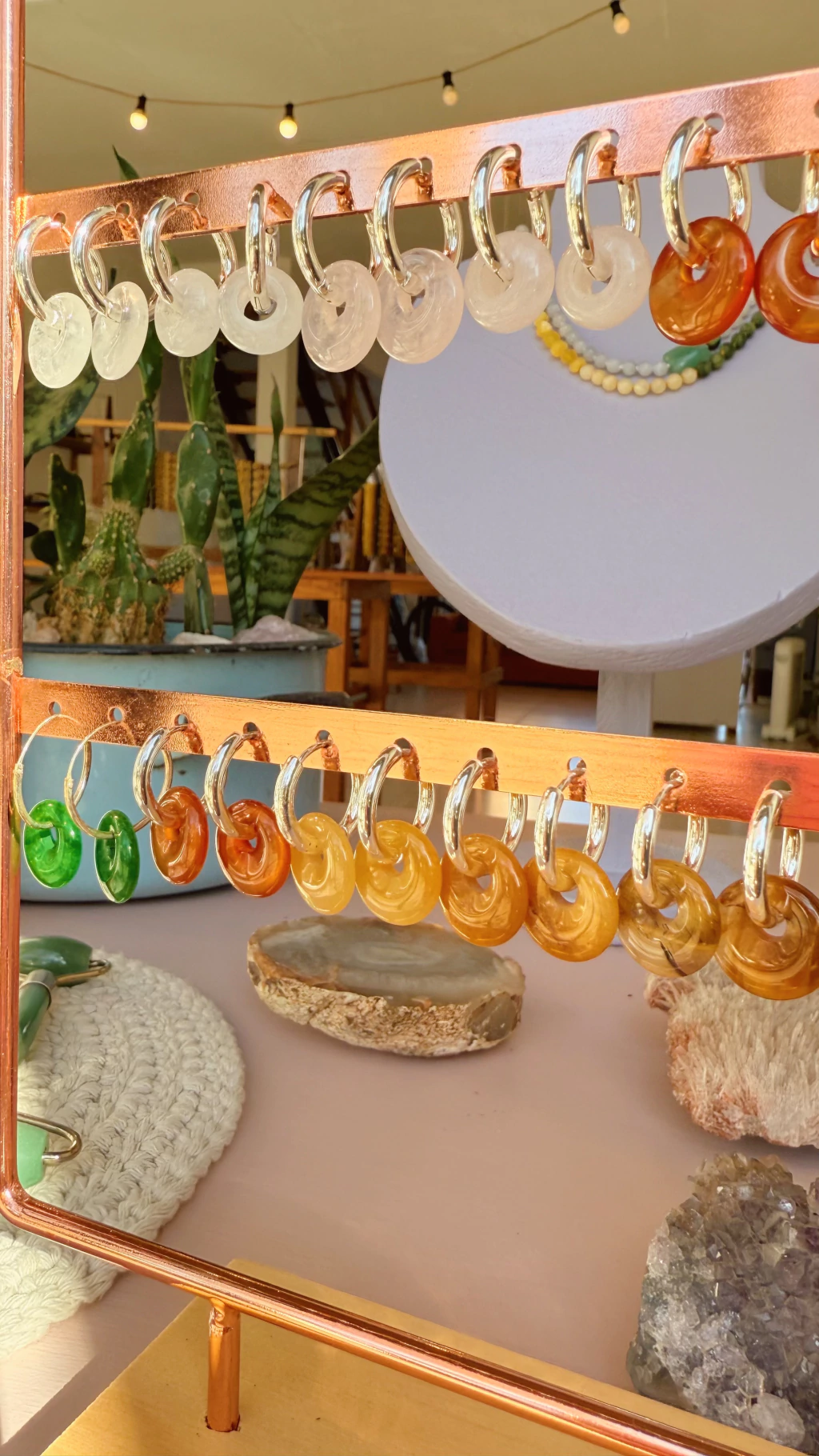 Aros Acero Blanco con Donas de Piedra Natural de Ágata Cornalina, Ojo de Tigre, Ágata India, Unakita y Obsidiana. Miden entre 1 cm y 2 cm