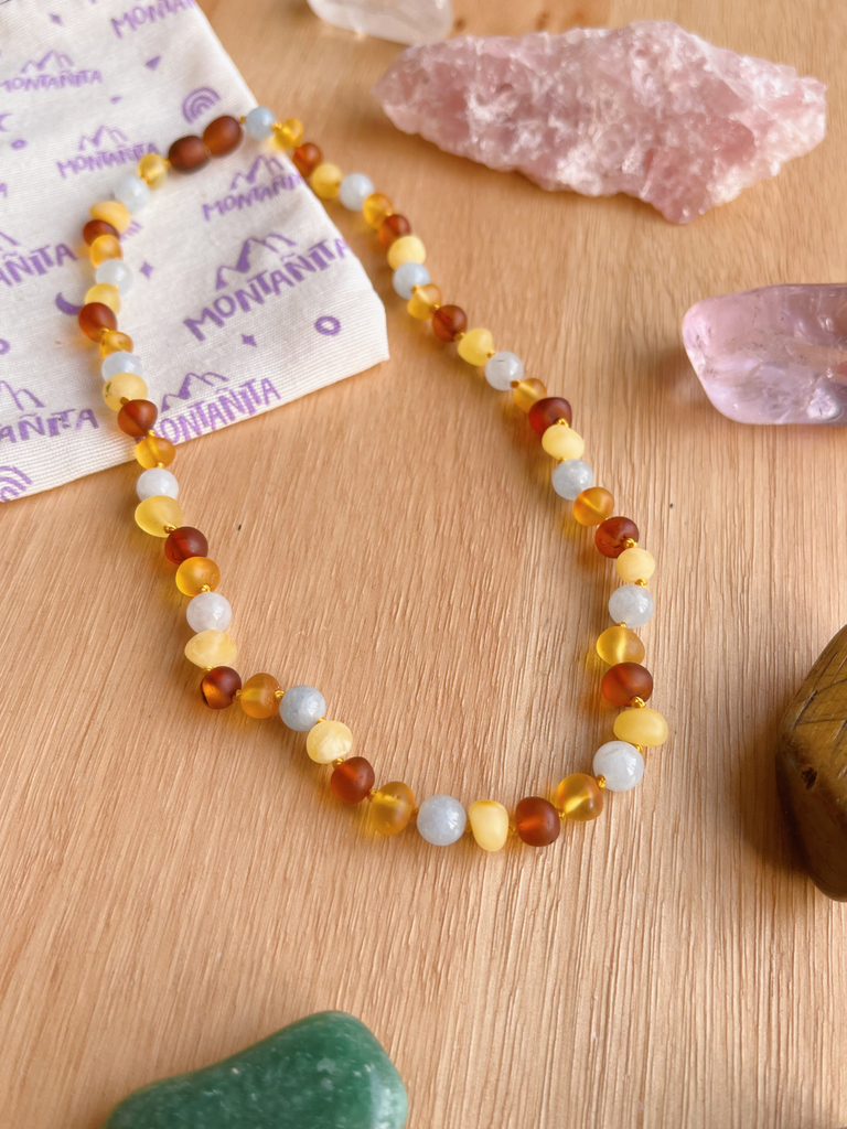 El ámbar contiene acido succinico, en contacto con el cuerpo es despedido y absorbido por nuestro torrente sanguineo, actuando como analgesico y antiinflamatorio natural; alivia dolores cervicales, articulares, de artritis, calma alergias e infecciones, regula glandula tiroides y tambien estabiliza el sistema inmunologico general.