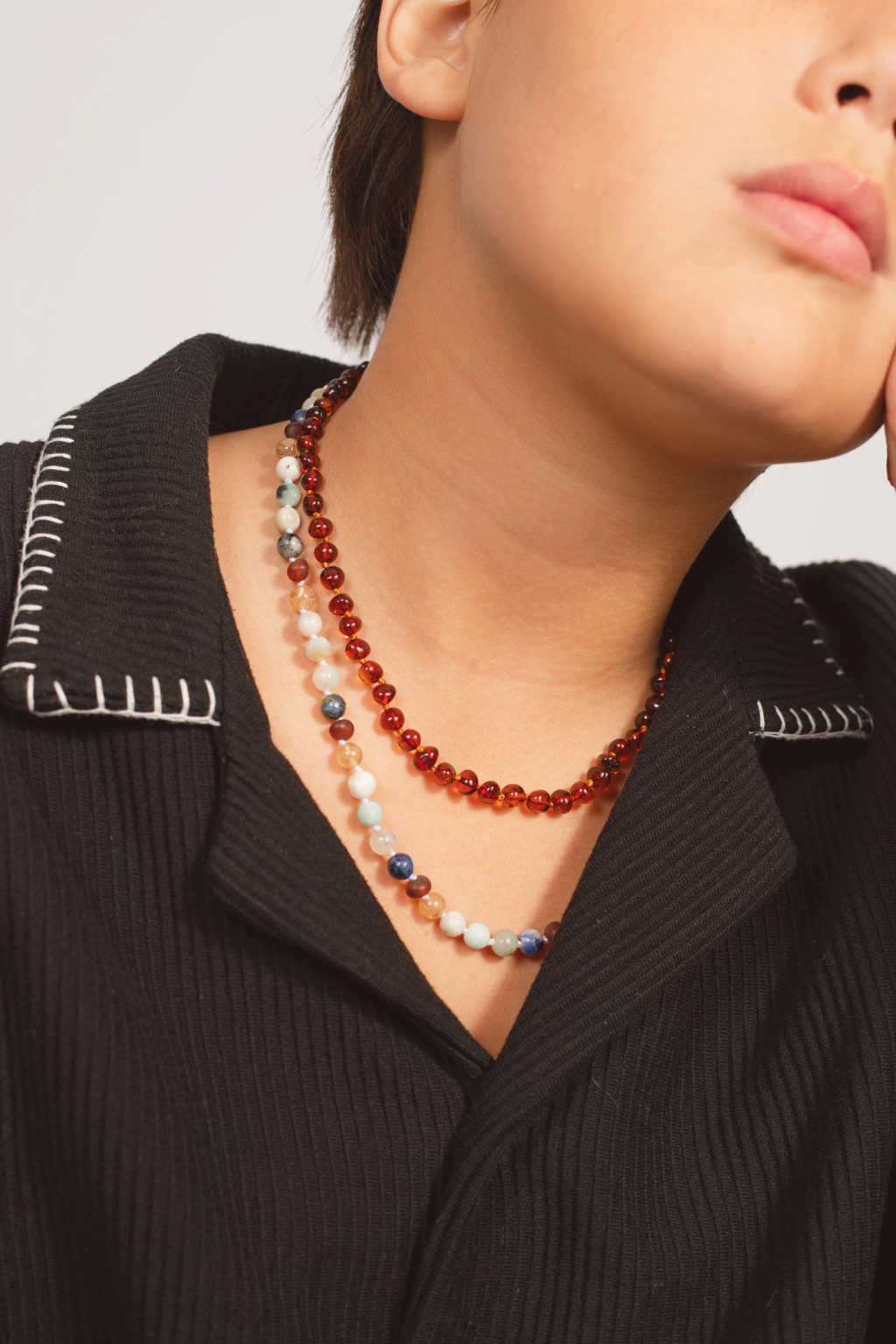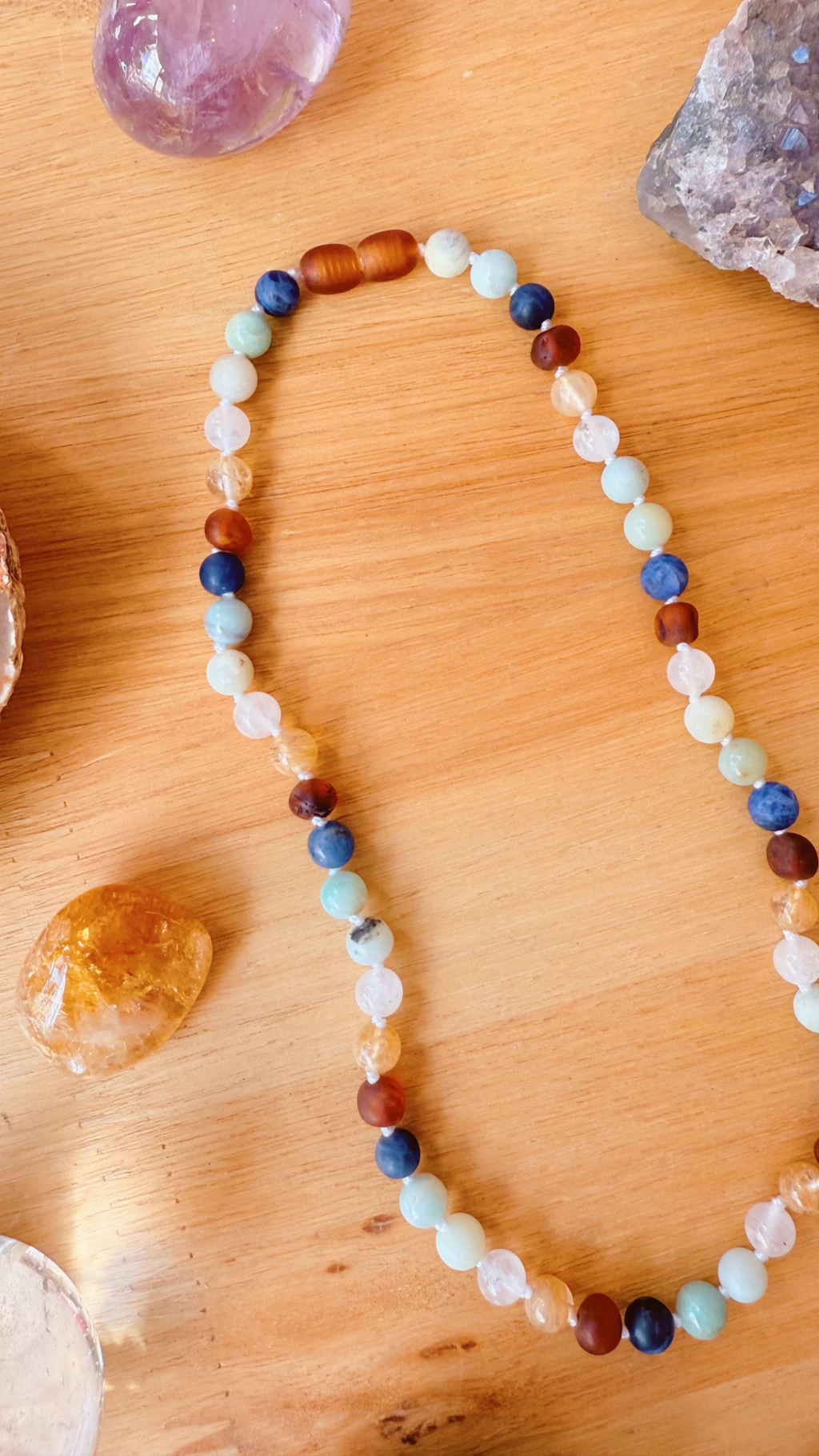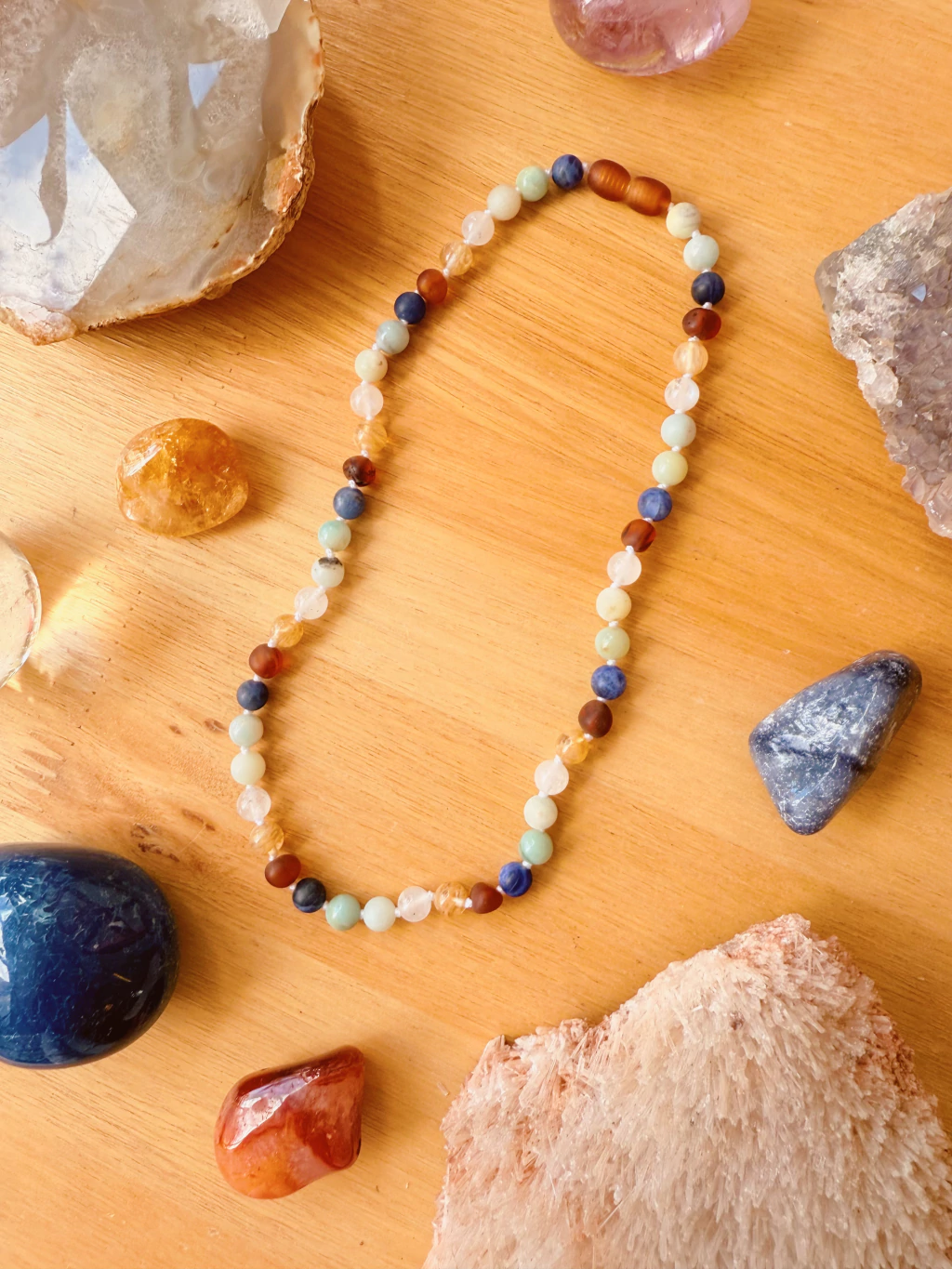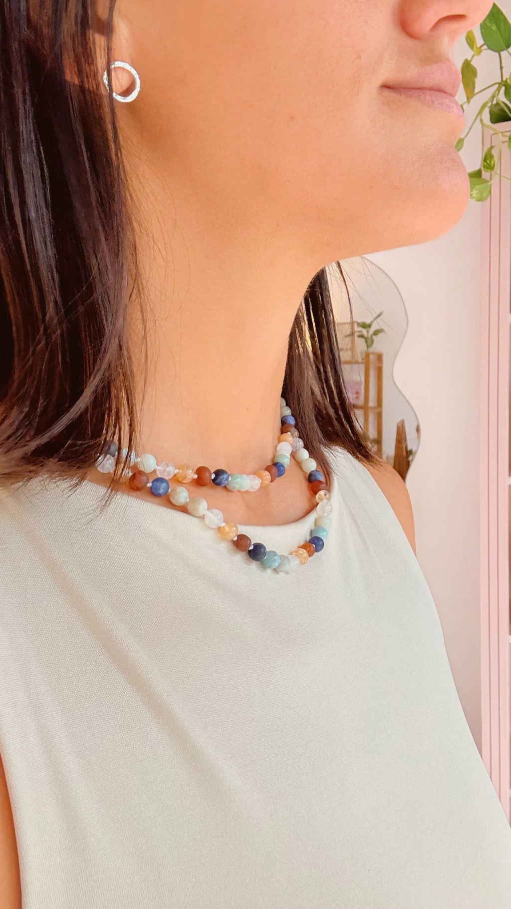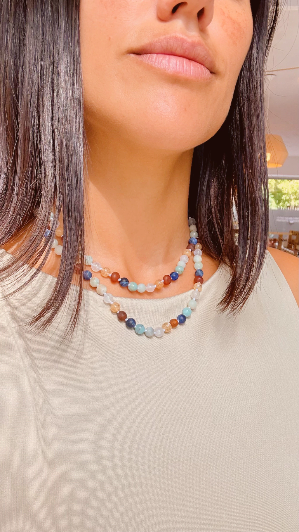 Descubre la elegancia y la energía del Collar Virgo, una pieza única que combina la belleza de la Sodalita, Amazonita, Citrino, Ámbar y Piedra Luna. Cada una de estas piedras tiene propiedades especiales que contribuyen a tu bienestar.